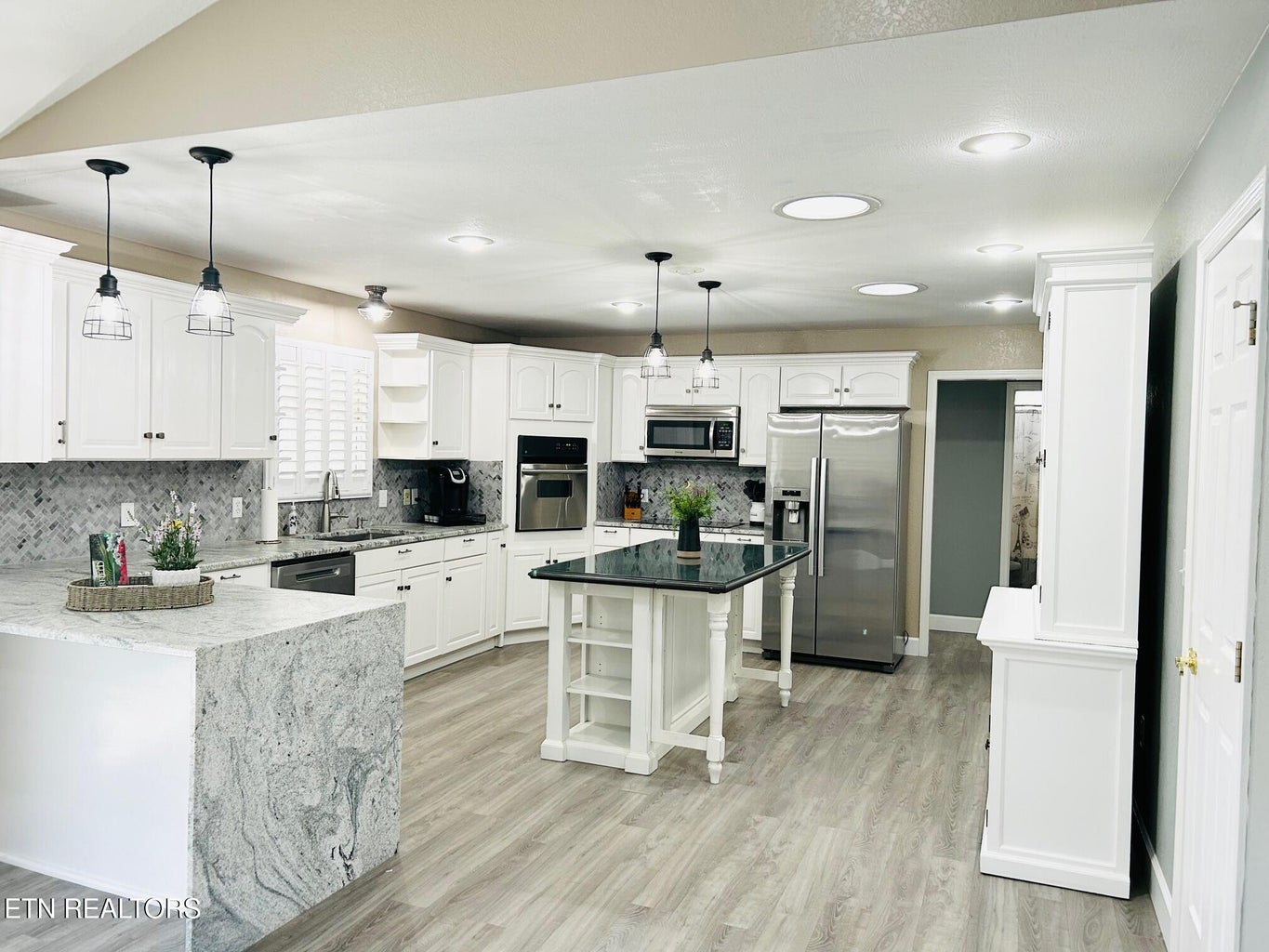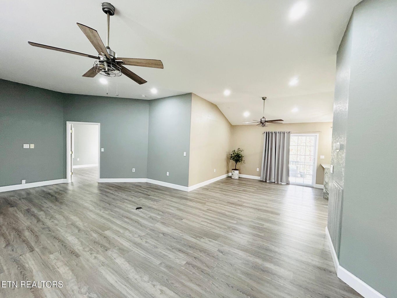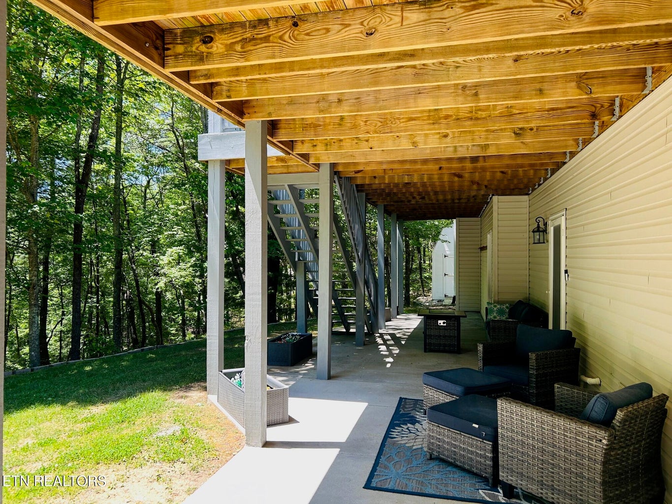 Nestled in the sought-after North Hampton subdivision of Fairfield Glade, this custom-built 4-bedroom, 3-bath basement ranch offers 3400 sqft of thoughtfully designed living space on 2.37 acres (2 lots). With a brick front exterior, an oversized circular driveway, 2 car garage with side door entry and a covered front porch, this home welcomes you with an inviting first impression. Step inside to an open-concept layout with 10' ceilings in the living and dining areas, a charming bay window, and a white and stone electric fireplace. The home features new enhanced vinyl plank flooring, fresh paint, new recessed lighting, decorative lighting and ceiling fans, and custom plantation shutters throughout the main level. Enjoy seamless indoor-outdoor living with a large dining area that opens to an expansive deck, partially covered for year-round enjoyment, offering seasonal mountain views. The gourmet kitchen is the heart of the home, featuring new stainless-steel appliances, a wall, oven, radiant electric cooktop, raised-panel cabinets, large island, pendant lighting, new granite countertops including a breakfast bar with a waterfall edge, decorative tile backsplash and a walk-in pantry. Additional highlights include a foyer closet, extra storage space, and a laundry area with a new washer and dryer. With a split-bedroom floor plan, the primary suite is a tranquil retreat, with abundant natural light, a private patio door to the deck, decorative barn doors leading to a walk-in closet, and the updated ensuite bathroom that features double vanities, new light fixtures, extra storage, walk-in shower, and a soaking tub. On the opposite side of the home, you'll find two comfortable bedrooms providing privacy for guests. One with a double door closet, large window, and private access to the guest bath. The other with a large closet and two large windows. The guest bath includes a vanity, tub/shower combo with a transom window. The redesigned lower level is perfect for entertaining, featuring a beautiful staircase leading into a spacious recreational room with new enhanced vinyl plank flooring, board and batten wainscotting, decorative ceiling tiles, multifunctional LED lighting, a beverage area, and a full bath. Also downstairs, you'll find an additional bedroom with ground-level access, a large storage room, and a dedicated workshop also with ground level access. Outdoor living is just as impressive with a side of the home garden area, freshly painted upper deck, a covered ground-level patio, and a storage shed. Additional upgrades include new landscaping, new sprinkler system, and new gutters. HVAC is approx 9 years old. This home is move-in ready with upgrades throughout. Don't wait to experience it for yourself! Buyer to verify all information and measurements to make an informed decision.