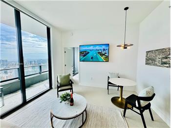 Elevated Miami living from the 48th floor of this stunning furnished 1-bedroom residence featuring breathtaking city and water views. This modern unit blends sophisticated design, floor-to-ceiling windows, and premium furnishings, offering the perfect balance of comfort and style. Open-concept living space with a sleek European kitchen, quartz countertops, and high-end appliances. The private balcony showcases panoramic views of Downtown Miami, Biscayne Bay, and the Atlantic horizon—ideal for morning coffee or sunset relaxation. World-class amenities, including a resort-style pool deck, f ...