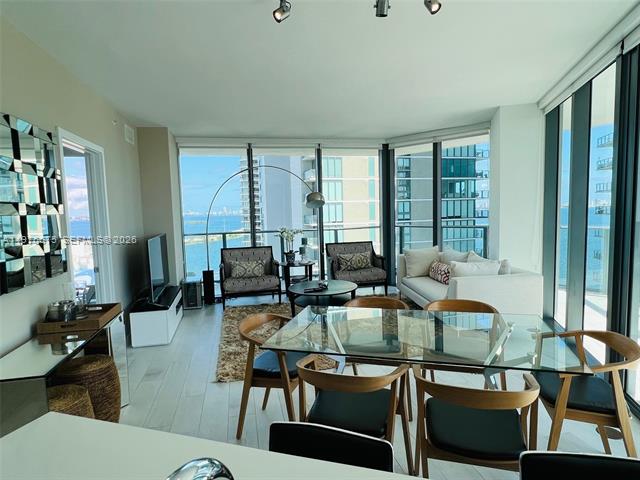 Modern, bright, and comfortable furnished 3-Bedroom / 2-Bathroom corner condo at Paraiso Bayviews, featuring beautiful views of Biscayne Bay and the downtown skyline. This residence features wood-like tile flooring, Italian kitchen cabinetry, and a spacious wrap-around balcony. Designed by Karim Rashid, residents enjoy great amenities, including a rooftop pool, a second pool on the 5th-floor amenity deck, hot tub, BBQ area, fitness room, spa with sauna, kid's playroom, a multi-purpose game room, and tennis courts. Ideally located in Edgewater, just minutes from Midtown Miami, Miami Design District, Whole Foods Market, and Wynwood. Easy access to major highways (I-195/I-95), Miami International Airport, and Miami Beach. *Includes basic cable, internet, and one assigned covered parking space.