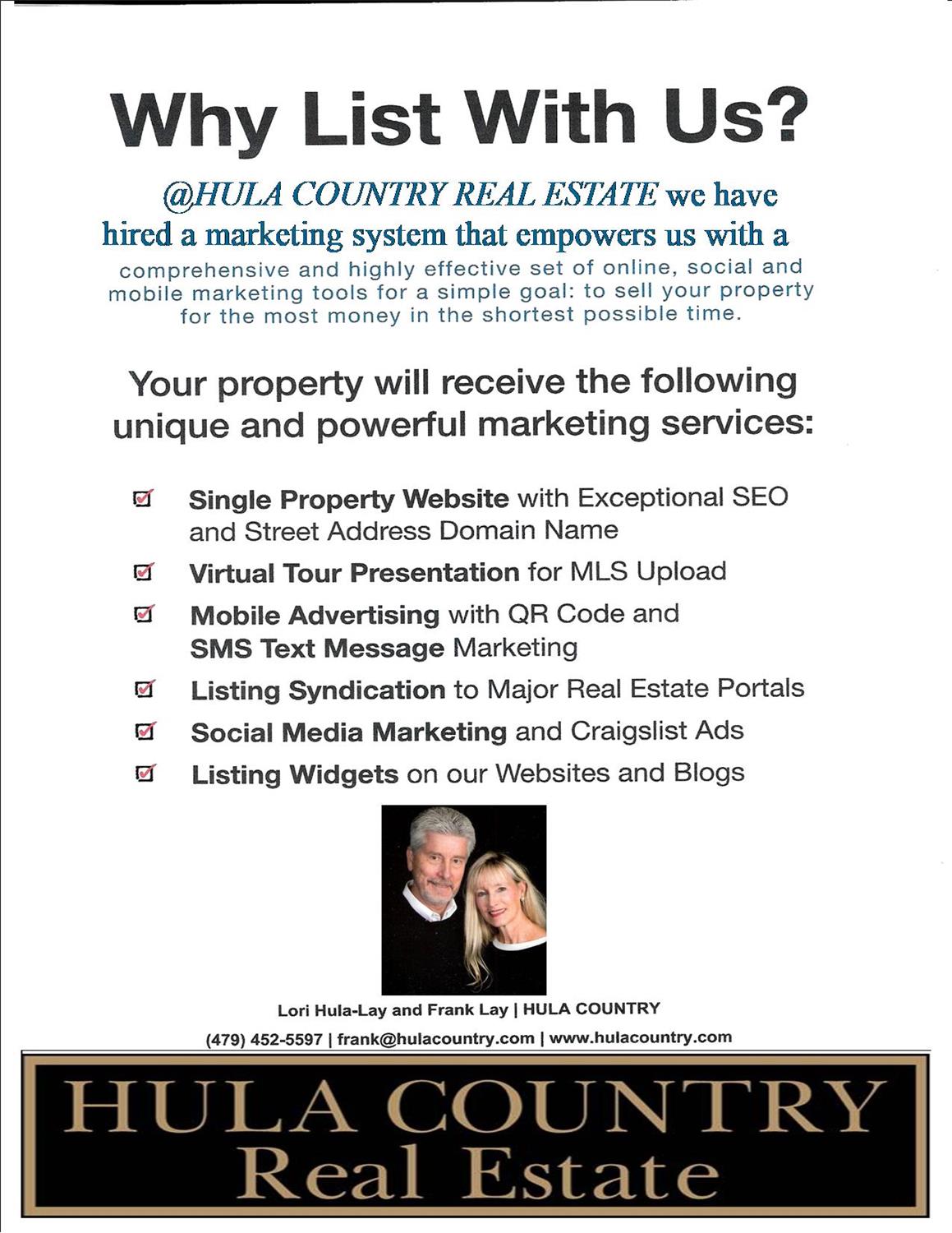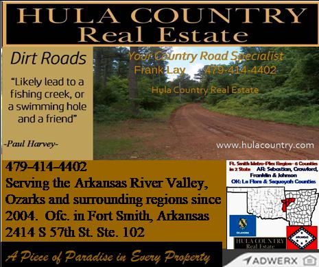 www.hulacountry.com ALOHA Y'ALL & WELCOME !!!! HULA COUNTRY Real Estate For Sale in the Arkansas River Valley and the Interior Highlands of the Ozark Mountains. "HULA"?? Country you ask, well yes, we think this region is full of Paradise Properties, and Lori's family name just happens to be "Hula" hence the name HULA COUNTRY.. We'd like to think there is a "Piece of Paradise" in every Property. We service all types of Real Estate. We will help you attain your dream of our Great American Heritage... Love of the Land and Property Ownership. . Serving the Fort Smith Metro-Ruralplex Region...in Arkansas: Sebastian, Crawford, Franklin and Johnson and surrounding counties since 2004. Lori Hula-Lay is a second generation Real Estate Professional and has been in the Real Estate Industry for 20+ years. Lori has a BS in Family and Consumer Sciences from the University of Nebraska.. Go Huskers !! and a Masters of Education from the University of Arkansas Fayetteville, AR... GO HOGS!!! Frank Lay was in the Banking Industry for 23 years prior to Real Estate. Frank has a BS Degree in Business from University of Oklahoma.... Go Sooners !! ! We are Your Independent Real Estate Professionals... (I-REPs) As Independent Real Estate Professionals, we are NOT bound by costly Franchise fees or Trade Organization fees which translates to lower commission rates for you. We DO adhere to a strict code of ethics, honesty and real estate laws. Our main concern is for our customers...to work on your behalf to treat each transaction as unique and individual as the people and properties we represent. We chose to go independent in 2011, to give you the best price, service and commitment possible before, during and after the real estate transaction. I-REP means I- REPresent you, not a franchise or trade organization ie.(Realtors)...but YOU... Sincerely, Your Independent Real Estate Professionals at Hula Country Real Estate Lori Hula-Lay and Frank Lay The Hula Team...