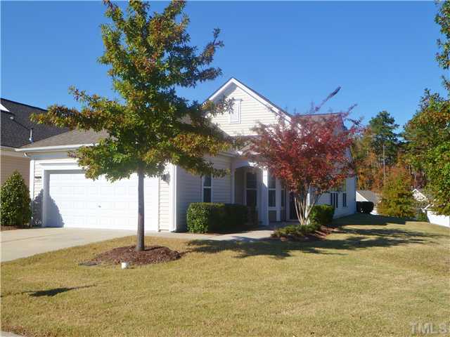 Cary NC Real Estate for Sale: Pine Spring floorplan in popular Carolina Preserve. 2 Bedrooms plus office with eat-in kitchen. Hardwoods in living room, dining room, office, kitchen and hallway. Upgraded light fixtures and ceiling fans. Covered rear patio on great corner lot. Attic storage in garage. Walking distance to 30,000 square foot clubhouse with indoor pool, tennis and bocce ball courts.