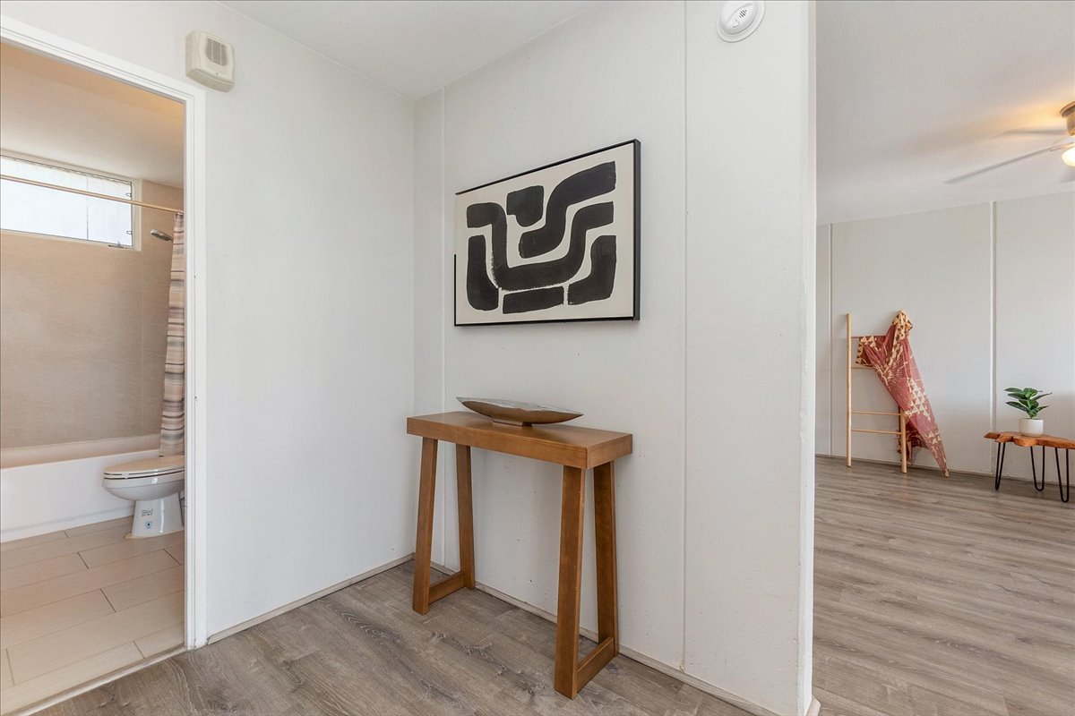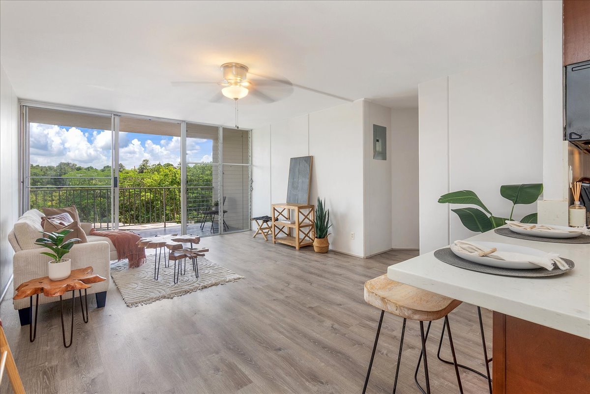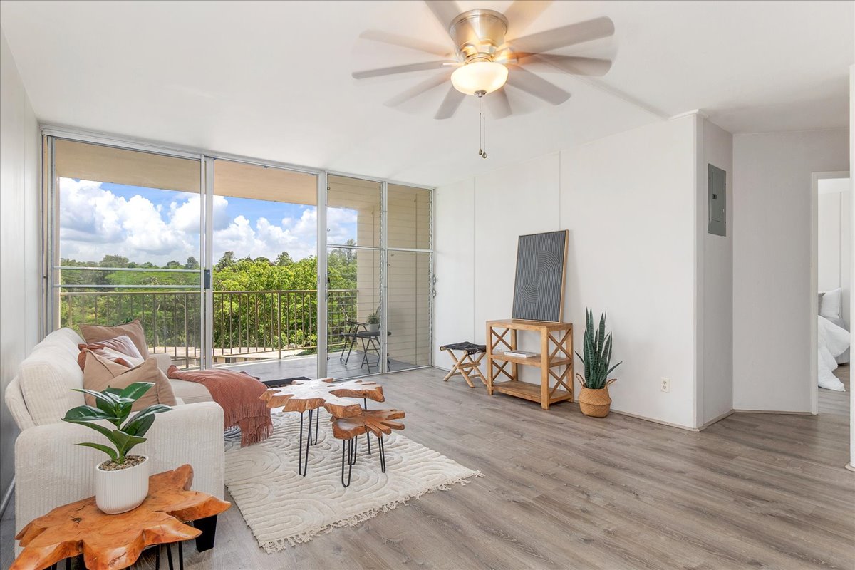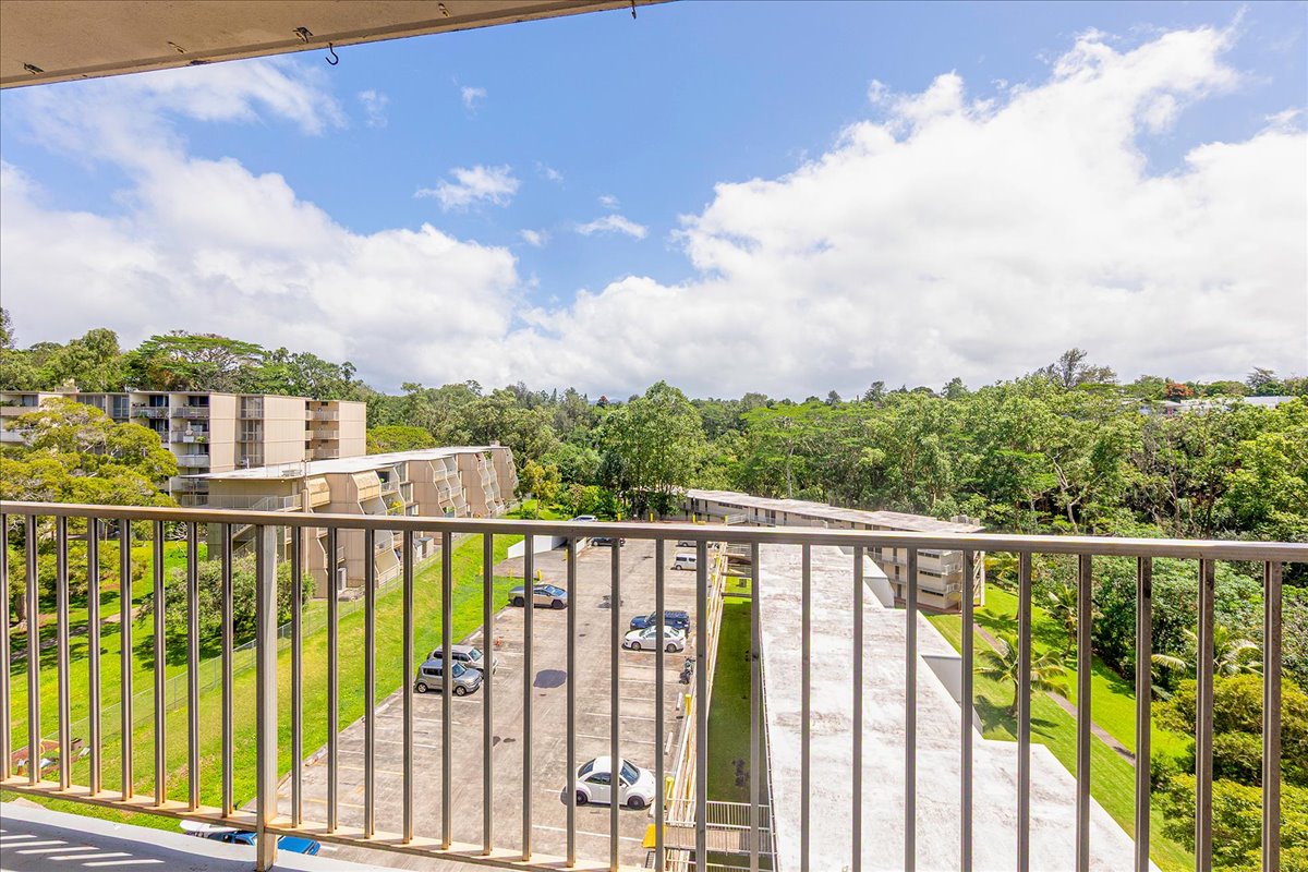 Discover this rare top-floor corner unit, offering breathtaking panoramic views and refreshing breezes. This comfortable 2-bedroom, 1-bath residence includes two dedicated parking spaces and has been upgraded with modern kitchen, flooring, and bathroom. Enjoy the large open lanai, perfect for relaxation. Convenience is at your fingertips with included washer/dryer and dishwasher. Residents have access to the Valley Recreational Center, featuring a large swimming pool, volleyball court, and nearby outdoor playground and basketball court. Northbrook-Melemanu is VA-approved and pet-friendly, located just minutes from Mililani Shopping Center, golf courses, Wheeler Army Airfield, Schofield Barracks, and all the conveniences of the desirable Mililani neighborhood.