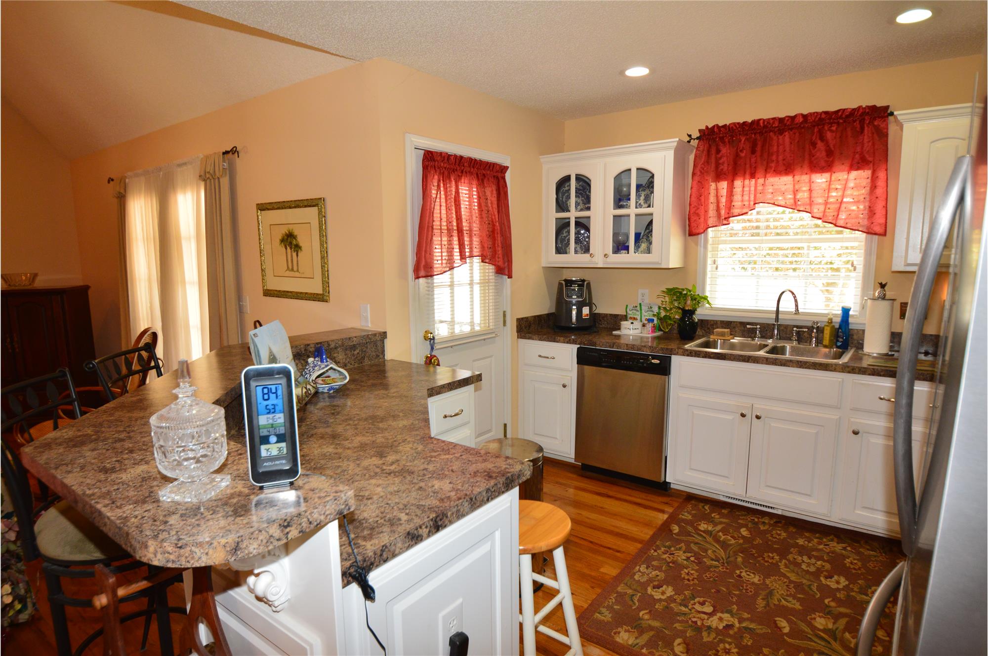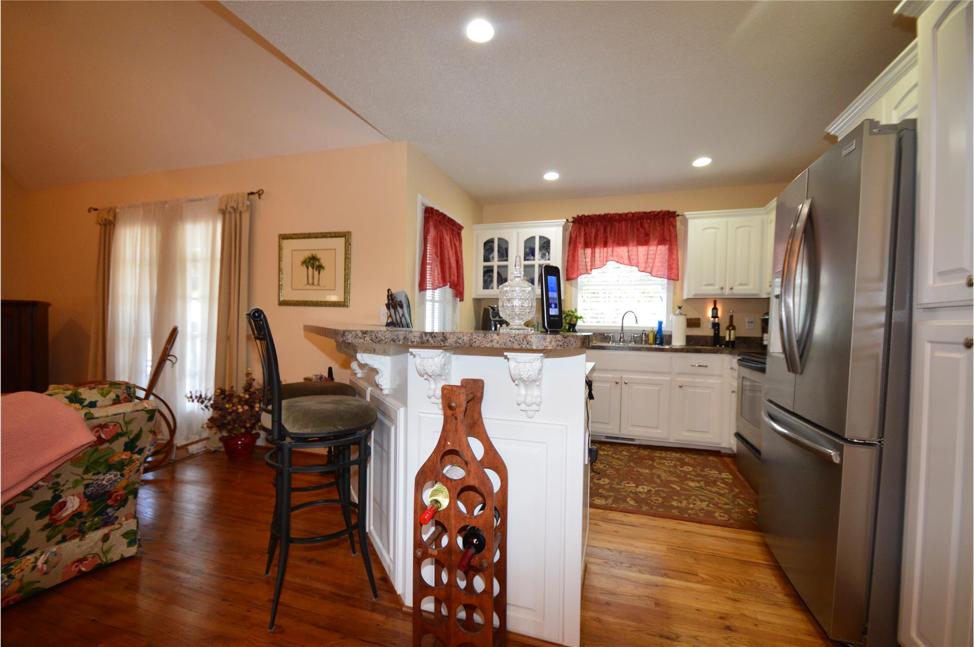 The kitchen is both functional and inviting, equipped with stainless steel appliances, a pantry, and a bar accented with decorative corbels— adding a touch of sophistication.