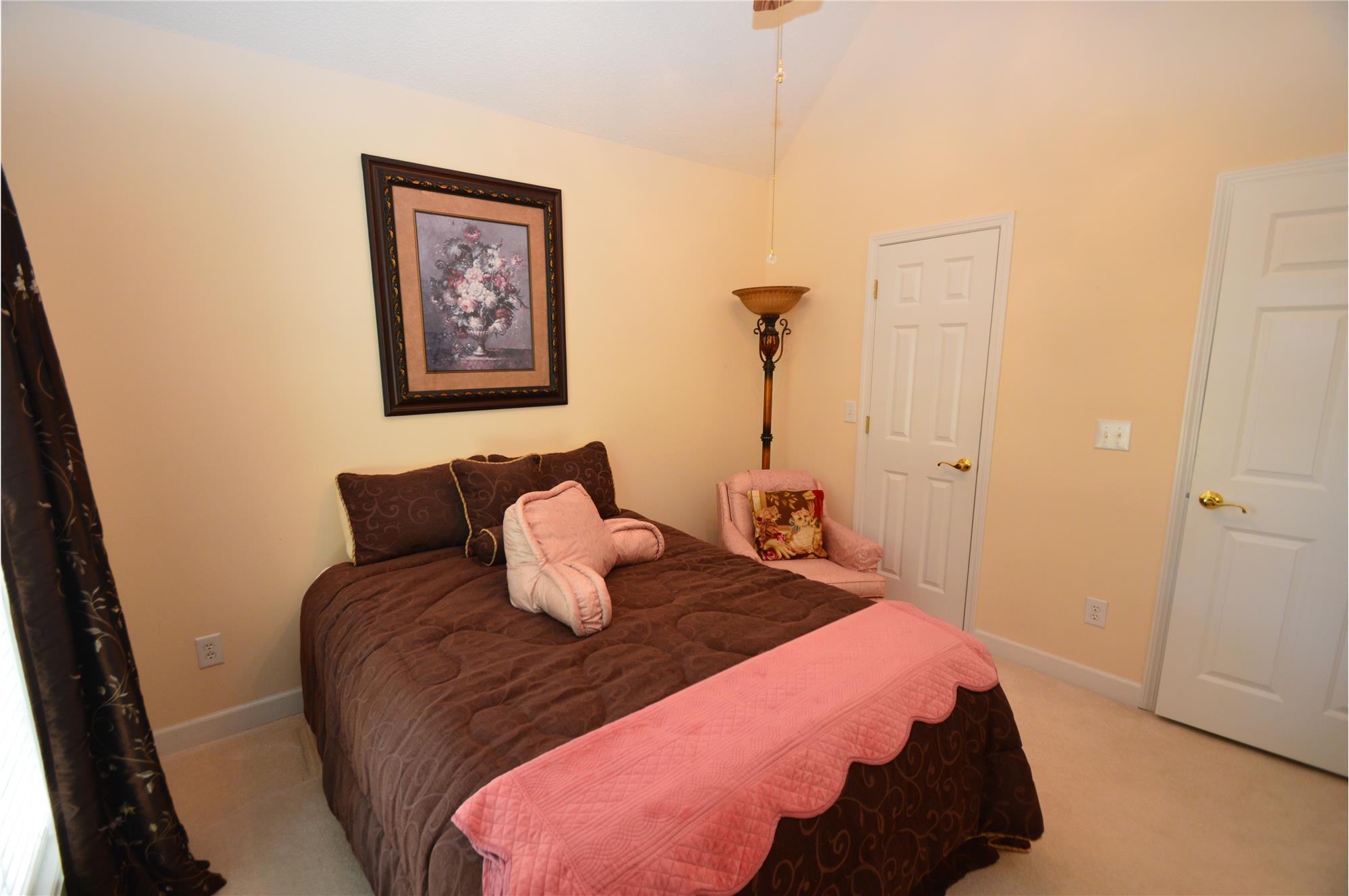 The generously sized primary suite impresses with cathedral ceilings and a private en-suite bath complete with a soaking tub, separate shower, and a professionally designed closet. The second bedroom offers a walk-in closet, providing excellent storage.