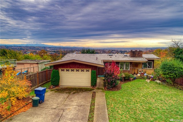 1.23 Acre property features stunning PNW views! Base to summit views of Mt Rainier by day & twinkling city lights by night. Mid Century Modern design, endless potential--ready for your personal touches to take it over the top! 4 Bedrooms, 1.75 bathrooms. Views from Master, Kitchen, & living rm. 3 bedrooms on the main floor including Master. Original hardwoods. Spacious downstairs w/ rec room, workshop & solarium. Property feels private & serene, yet excellent location for commuting & entertainment, 10 miles to downtown Seattle!
