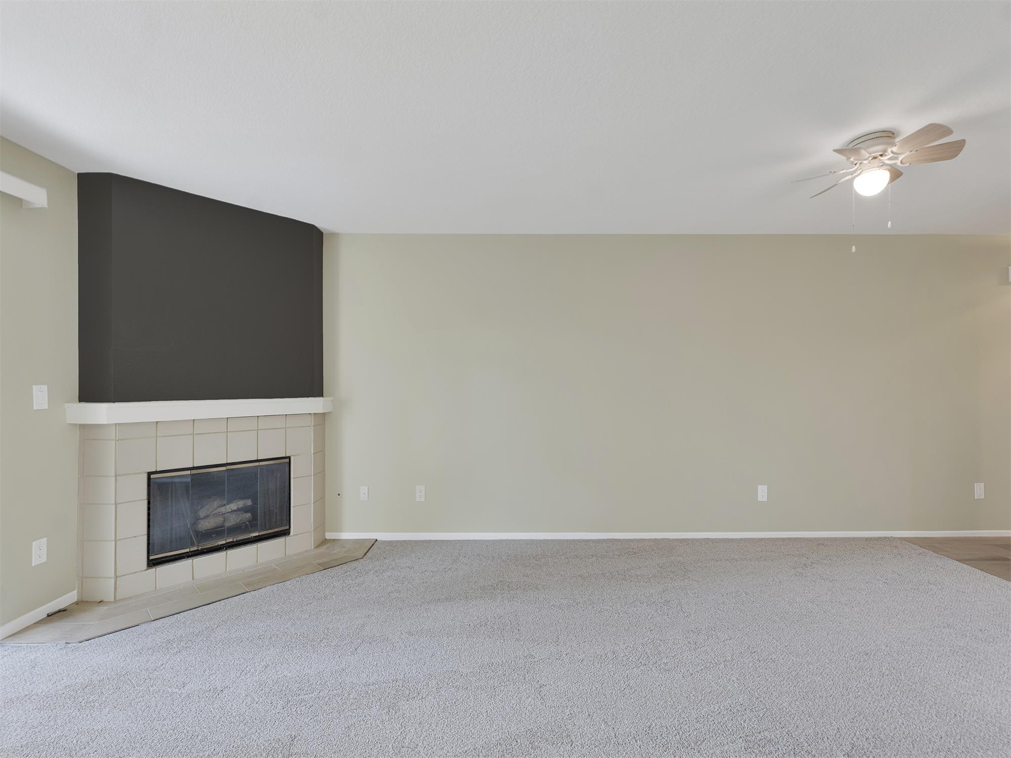 Living room with white tile gas fireplace