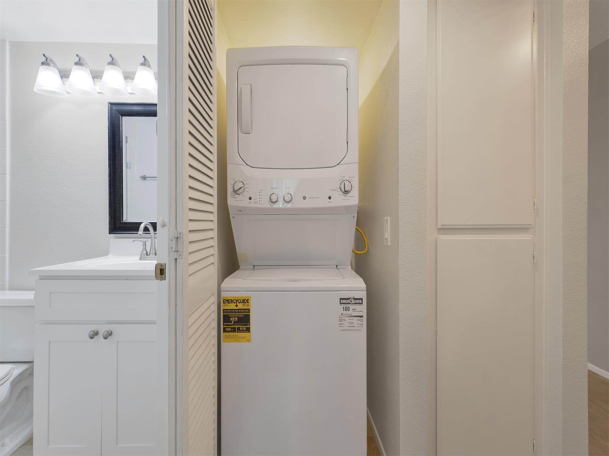 Laundry closet with stackable GE washer and dryer included