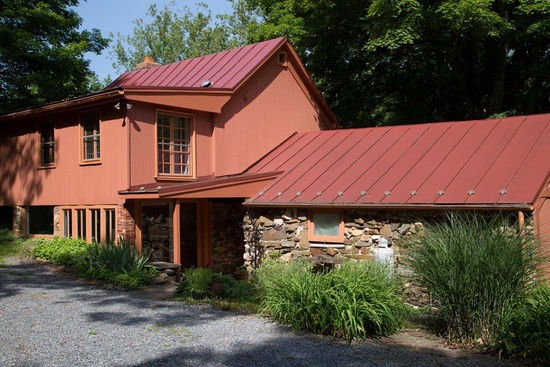 Charming renovated historic Winchester Virginia log home for sale with stone wall and floors, wood walls and floors. Library with mezzanine. 1 bedroom guest cottage. Outbuildings, creek, pond, gardens. 3 miles from Winchester Medical Center