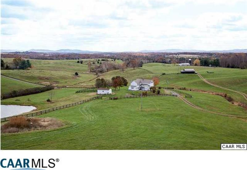 Albemarle County historic home for sale on 56 bucolic acres in the Farmington Hunt with rolling fields and 360 degree mountain views from this 19th century chestnut log farmhouse. Circa 1900 farm house has encompassed the period log home. Pole barn, shed, & other outbuildings. Property is fenced. 4 division rights.