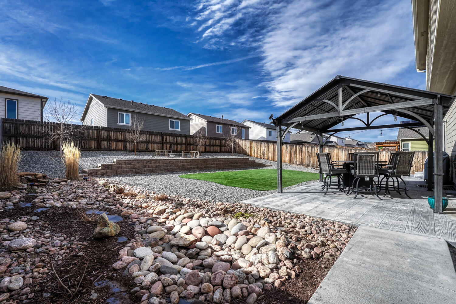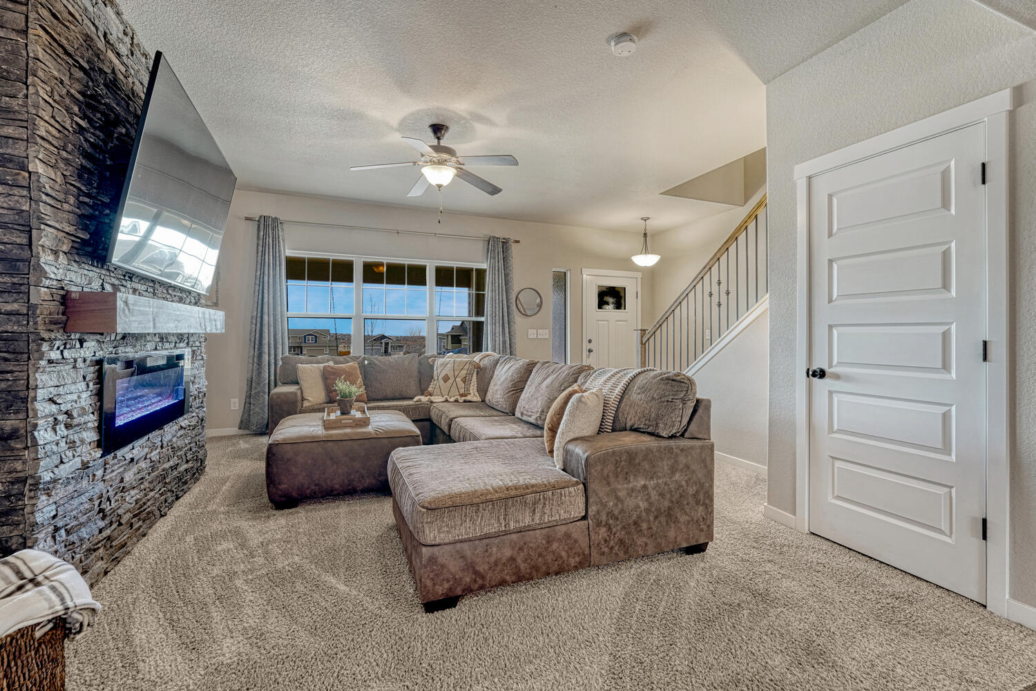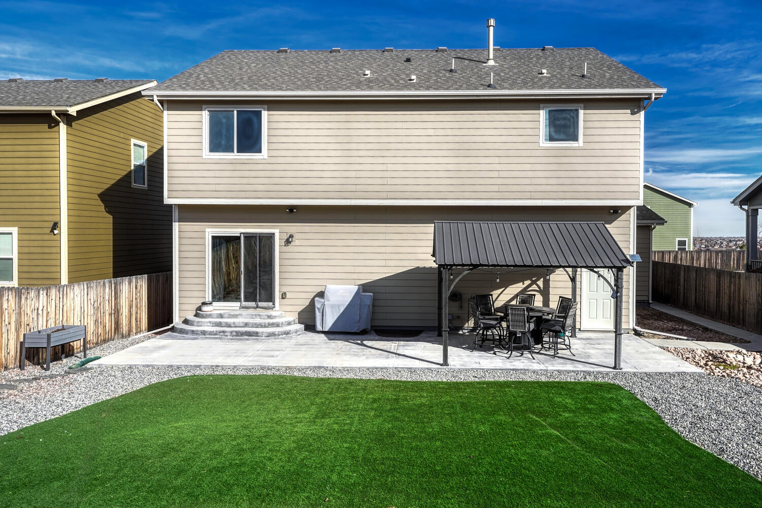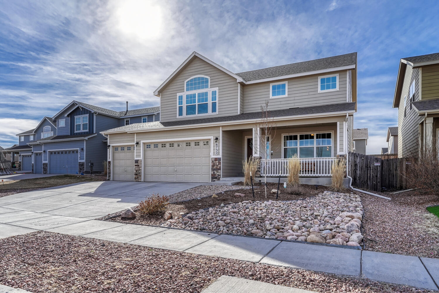 Pristine & beautifully upgraded 4BR, 4BA 2-story home with Finished Basement & oversized 4-Car Garage. Nestled on a fenced 0.18-acre lot with breathtaking Pikes Peak views. The low-maintenance, xeriscaped front yard & covered front porch create a fabulous 1st impression! Inside, 3,280 sf of thoughtfully designed living space showcases quality finishes & numerous upgrades, including central A/C, efficient heating, ceiling fans, & window blinds, curtains, & rods throughout. Gleaming hardwood floors highlight the Entry, Dining Room, & Gourmet Kitchen. The inviting Living Room features neutral carpet, a lighted ceiling fan, & an electric fireplace with floor-to-ceiling stone surround, flowing seamlessly into the walk-out Dining Room & Kitchen, ideal for entertaining. The Dining Room offers modern pendant lighting & patio access. The Chef-Inspired Island Kitchen boasts granite countertops, espresso cabinetry, breakfast bar, pantry, & ample prep space. A convenient Powder Bath & Mudroom with direct garage access complete the main level. Upstairs, iron railings lead to a spacious Loft, Laundry Room, 3 BRs (one currently used as an office), & 2 Full Baths. The Primary Suite is a private retreat with sitting area, walk-in closet, & spa-like 5pc Bath with dual vanities, soaking tub, & separate shower. 2 addtl BRs share a Full Hall Bath with dual sinks & tiled tub/shower. The Finished Basement offers exceptional flexibility with a Family Room, Kitchenette/Wet Bar with refrigerator and dishwasher, BR with walk-in closet, & adjoining Full Bath, perfect for guests, in-laws, or a teen suite. The backyard is designed for relaxation & entertaining with auto sprinklers, expanded patio with gazebo, fire pit with bench seating, & stunning Peak views. Located near schools, parks, & hospital. Enjoy shopping, restaurants & entertainment along the Powers Corridor with easy access to I-25 & Peterson Space Force Base. Move-in ready & waiting for you to call it home.