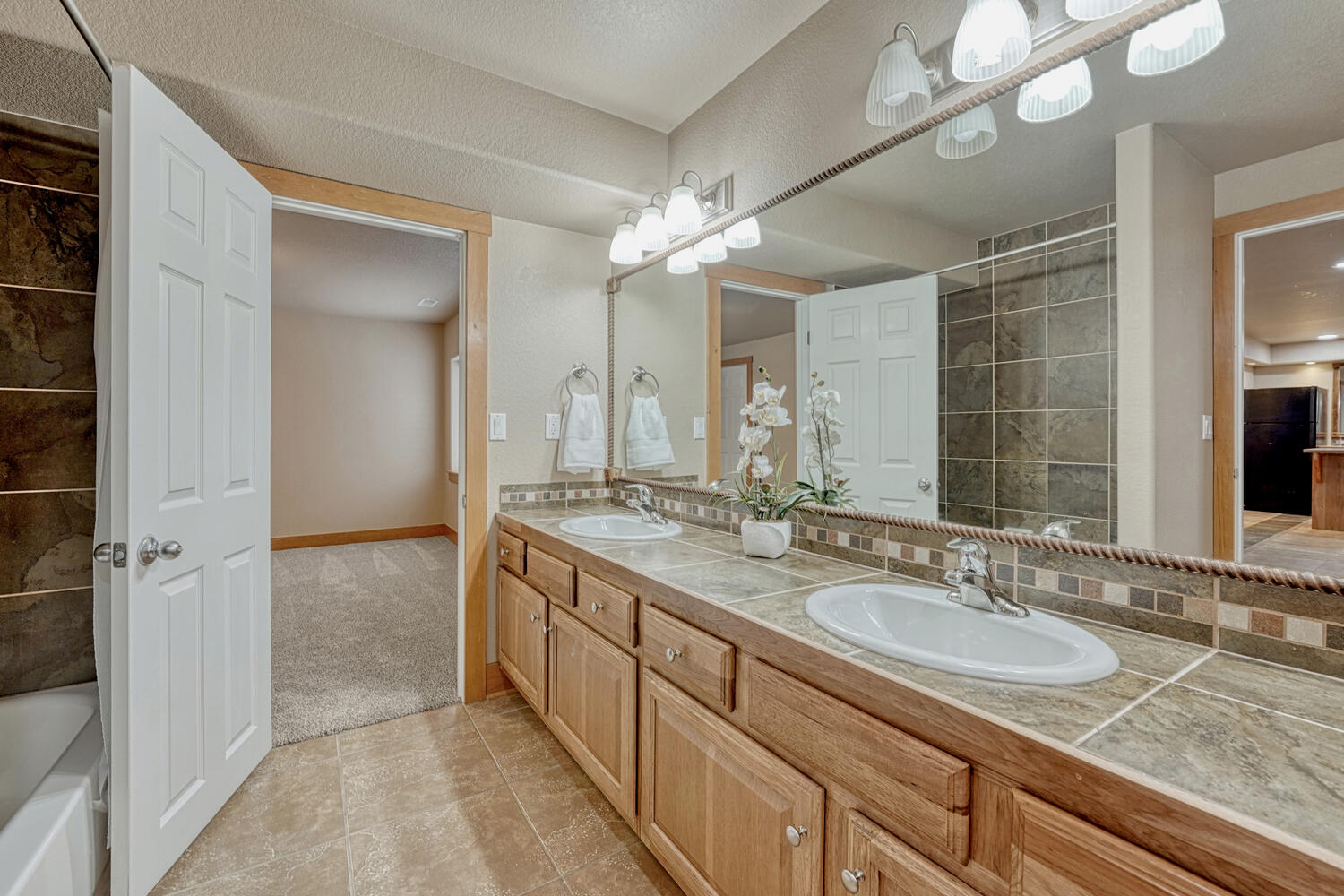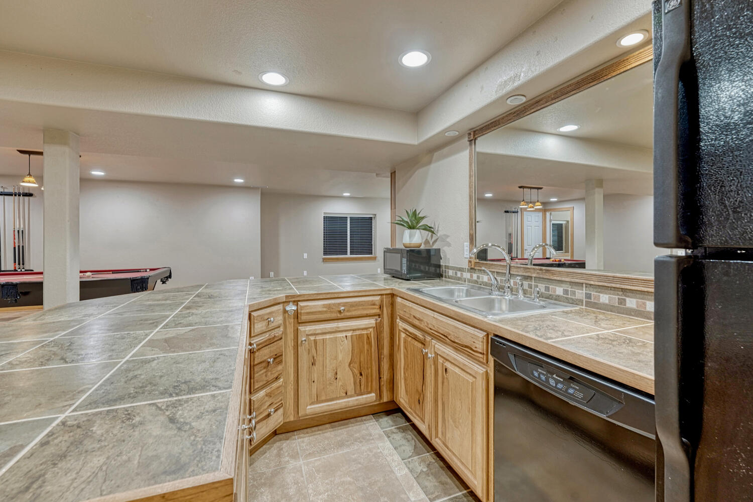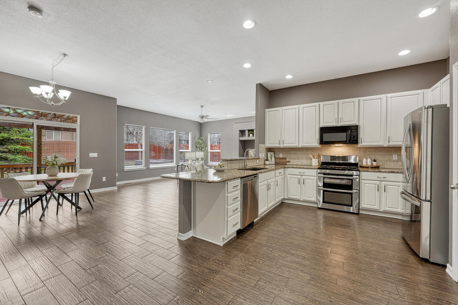 Stunning 5-bedroom, 3-bath ranch-style home located on a fully fenced 0.22-acre lot in the highly sought-after Meridian Ranch community. Designed with comfort and functionality, this home features central air, a bright, open floor plan with abundant storage, perfect for both everyday living and entertaining. A covered front porch creates a warm welcome. Inside, 10ft ceilings and gorgeous wood-look tile flooring throughout most of the main level. The spacious Great Room is filled with natural light from a wall of windows and offers built-in niches, a gas fireplace, ceiling fan, and prewiring for surround sound. The kitchen is a chef's delight, featuring a breakfast bar, pantry, white roll-out cabinetry, granite countertops, and a composite granite sink. A full suite of appliances includes a gas range with double ovens, microwave, dishwasher, and French door refrigerator. The adjoining dining area opens to a large deck with pergola, ideal for indoor-outdoor living. The private Primary Suite offers neutral carpet, a walk-in closet, ceiling fan, and a luxurious 5-piece bath with a dual sink vanity, soaking tub, and enclosed tiled shower. Main level laundry & central vac. 2 addt'l main-level bedrooms share a beautifully appointed full bath. The finished basement is an entertainer's dream with a massive family room, game area (pool table included), & a kitchenette/wet bar with refrigerator, dishwasher, & microwave. Two more bedrooms share a full bath with bedroom access. A spacious craft/flex room completes the lower level. Step outside to your own backyard oasis with mature landscaping, auto sprinklers, a large wood deck, pergola, hot tub, fire pit, & dog run. A 3-car tandem garage adds convenience & storage. Enjoy nearby walking trails & access to the Meridian Ranch Field House offering a field, indoor track, and fitness center and the Rec Center offering a pool, fitness center, & playground. This home truly has it all! MOVE-IN READY and waiting for you to call it home!