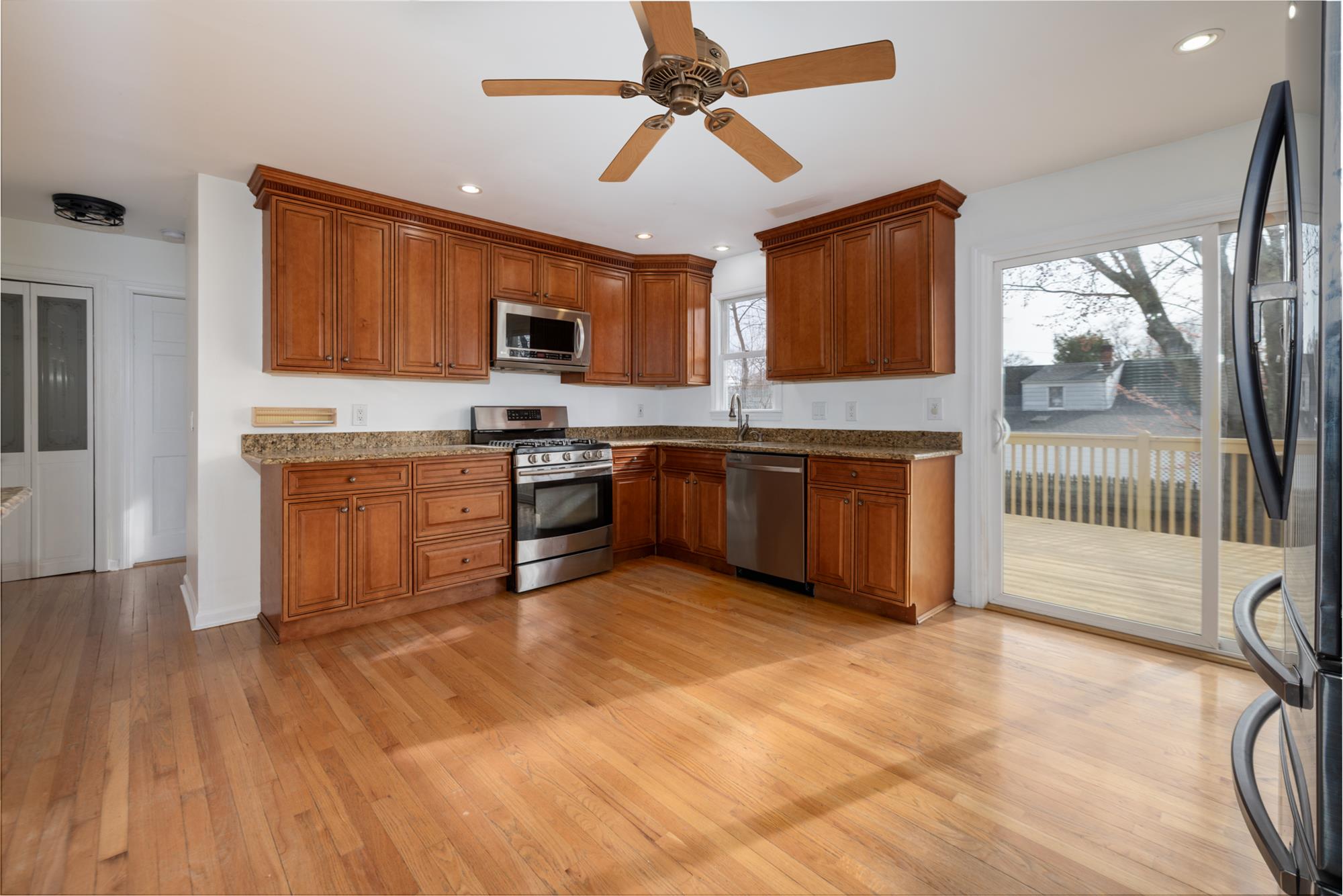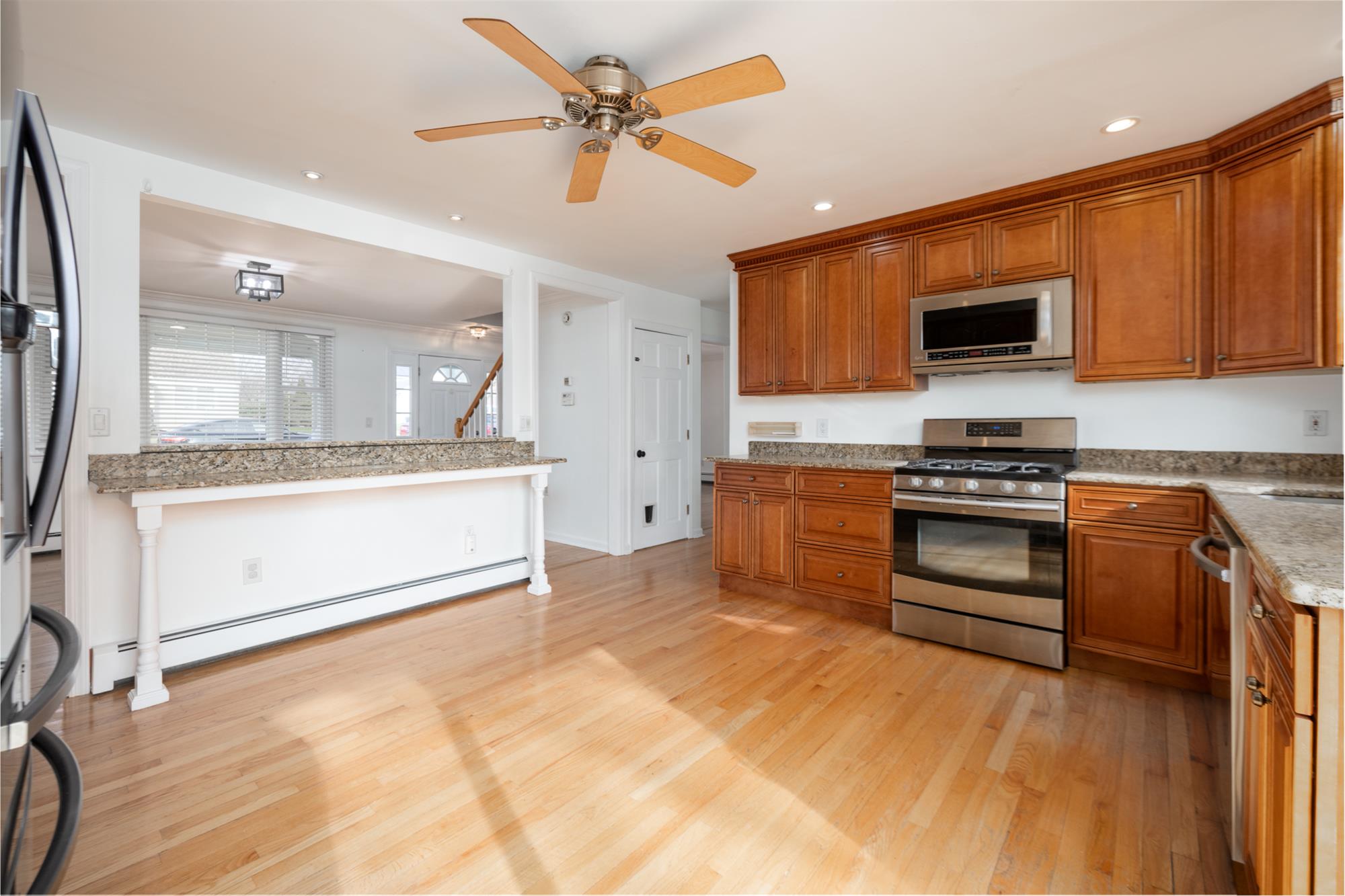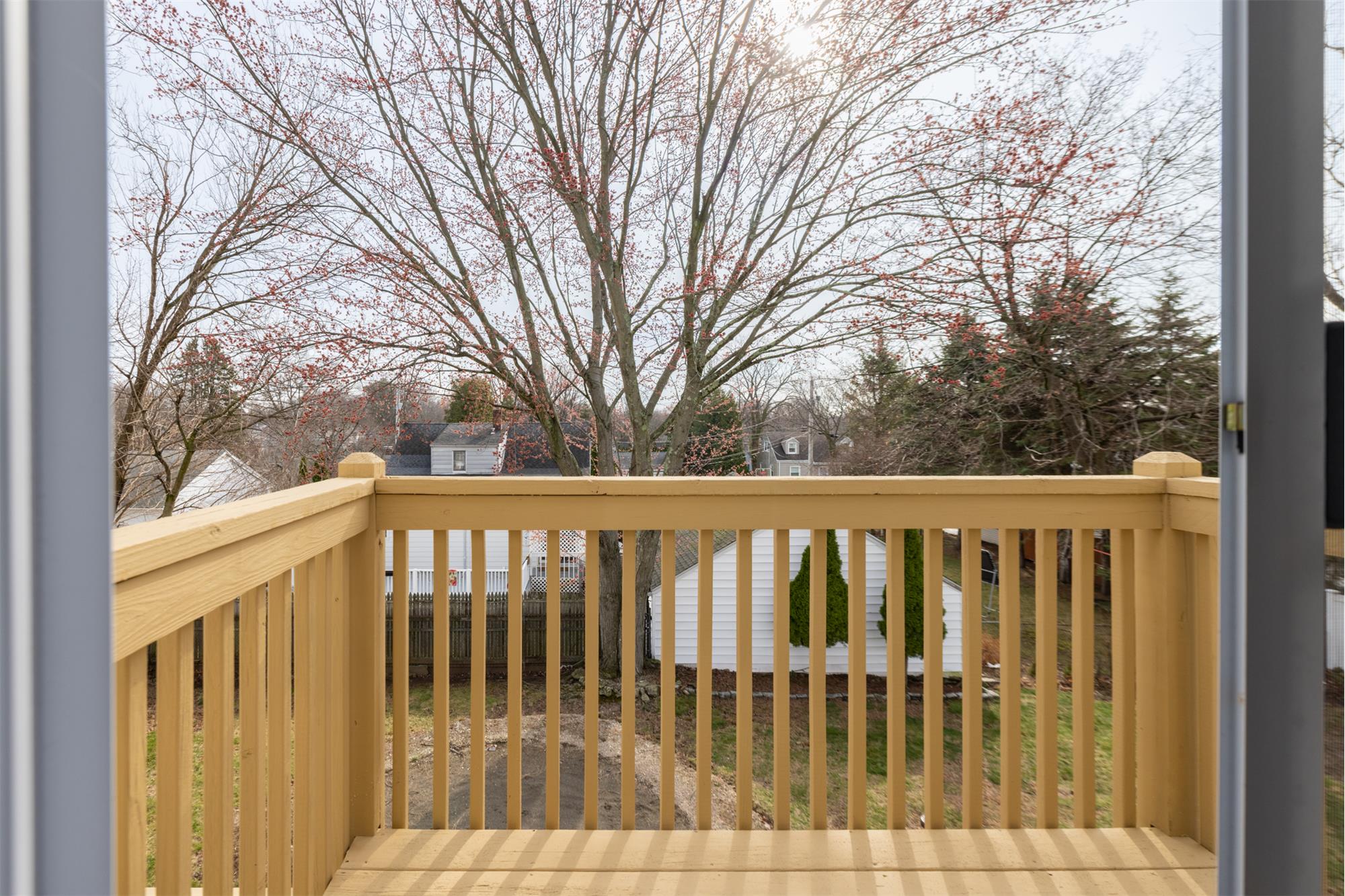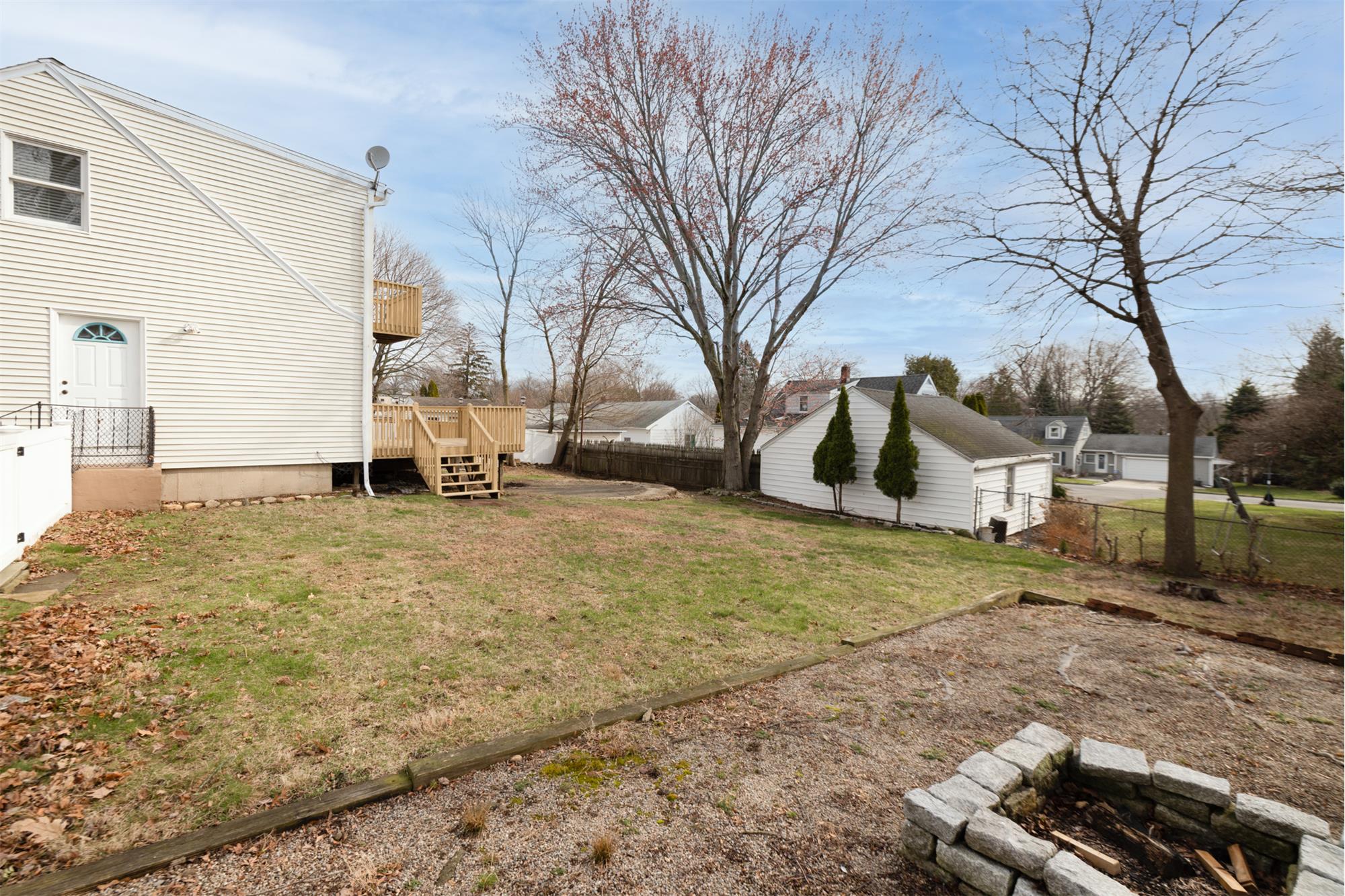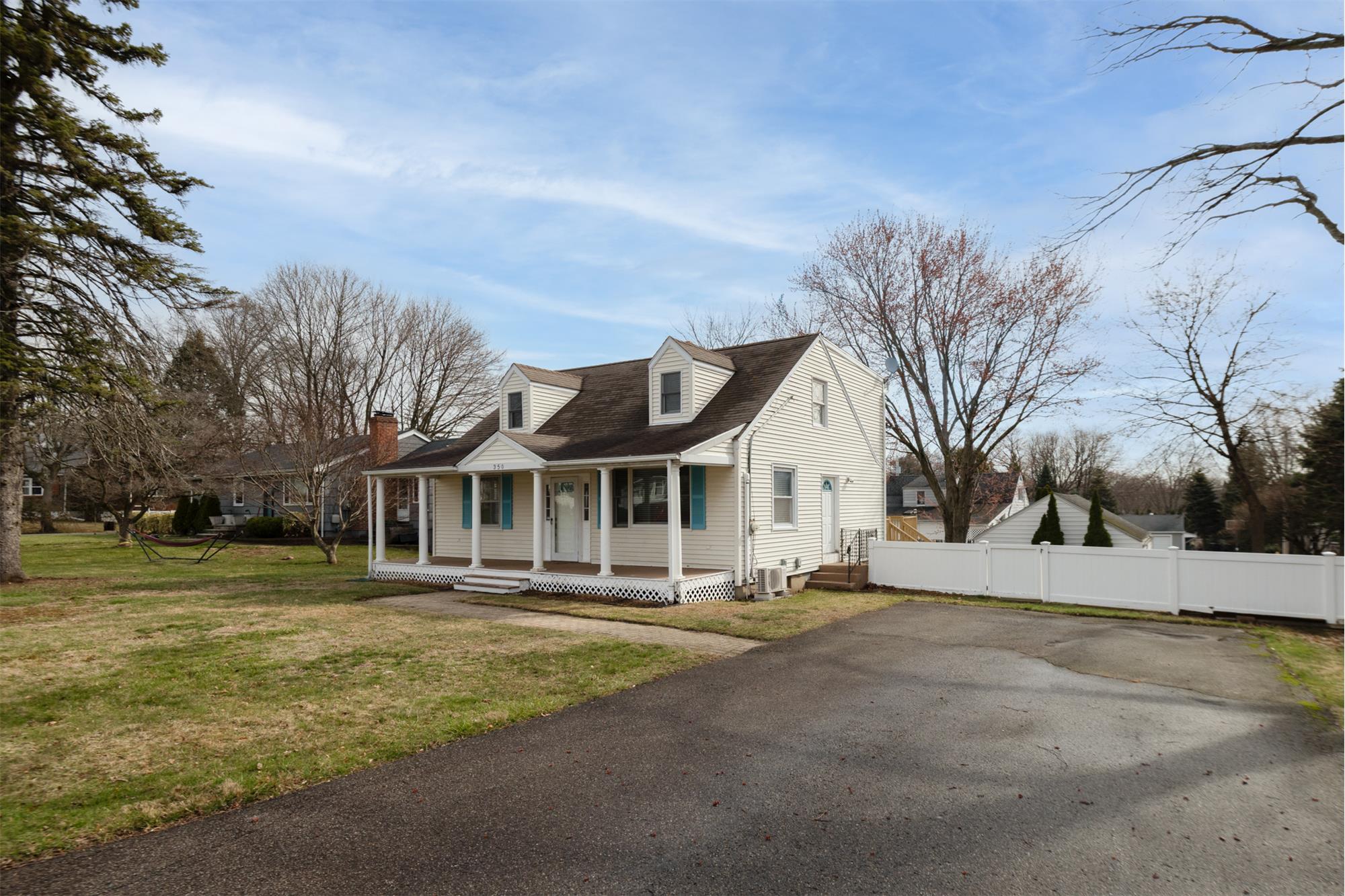 Charming, clean, and ready to move in Cape-style home (fully dormered in back) located on a quiet dead-end street with an oversized driveway offering ample off-street parking. Features a semi-open floor plan with hardwood floors, spacious living room, formal dining room, first-floor bedroom and full bath. The kitchen includes granite countertops, stainless steel appliances, breakfast bar, and plenty of cabinet and counter space. Upstairs offers a large primary bedroom suite with private balcony, generous closet space, and recessed lighting, and full bath with skylight. 3rd bedroom also on the upper level. Fully finished basement provides extra living space, ideal for a family room, and additional office space, along with separate laundry room and ample storage. Enjoy the oversized fenced-in backyard with a large deck, fire pit, and shed-perfect for entertaining. Conveniently located near schools, shopping, dining, and major commuter routes.