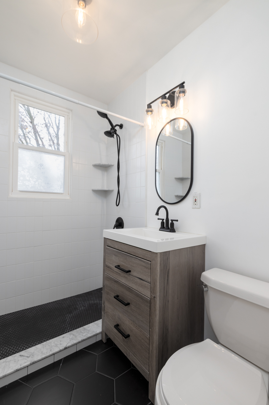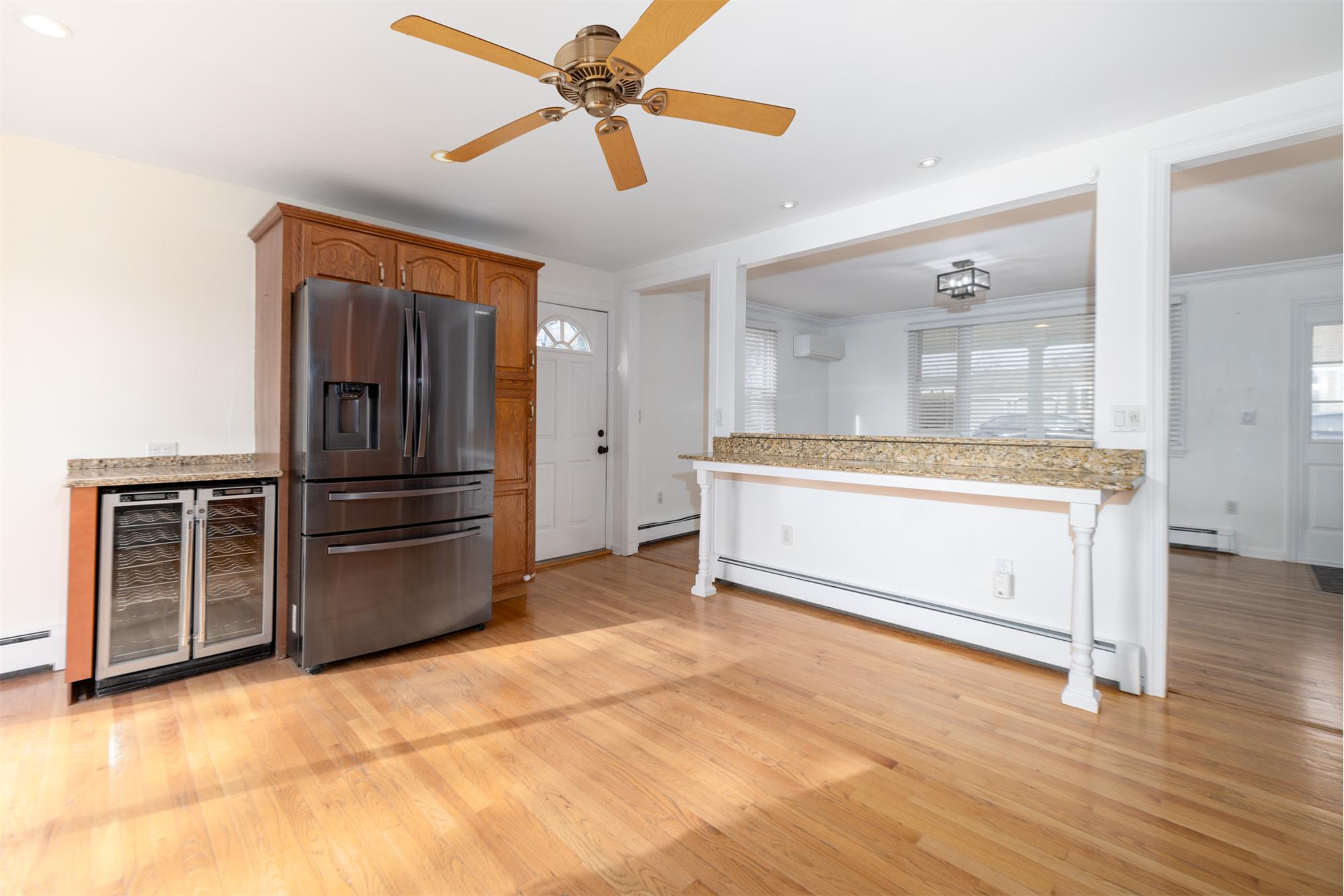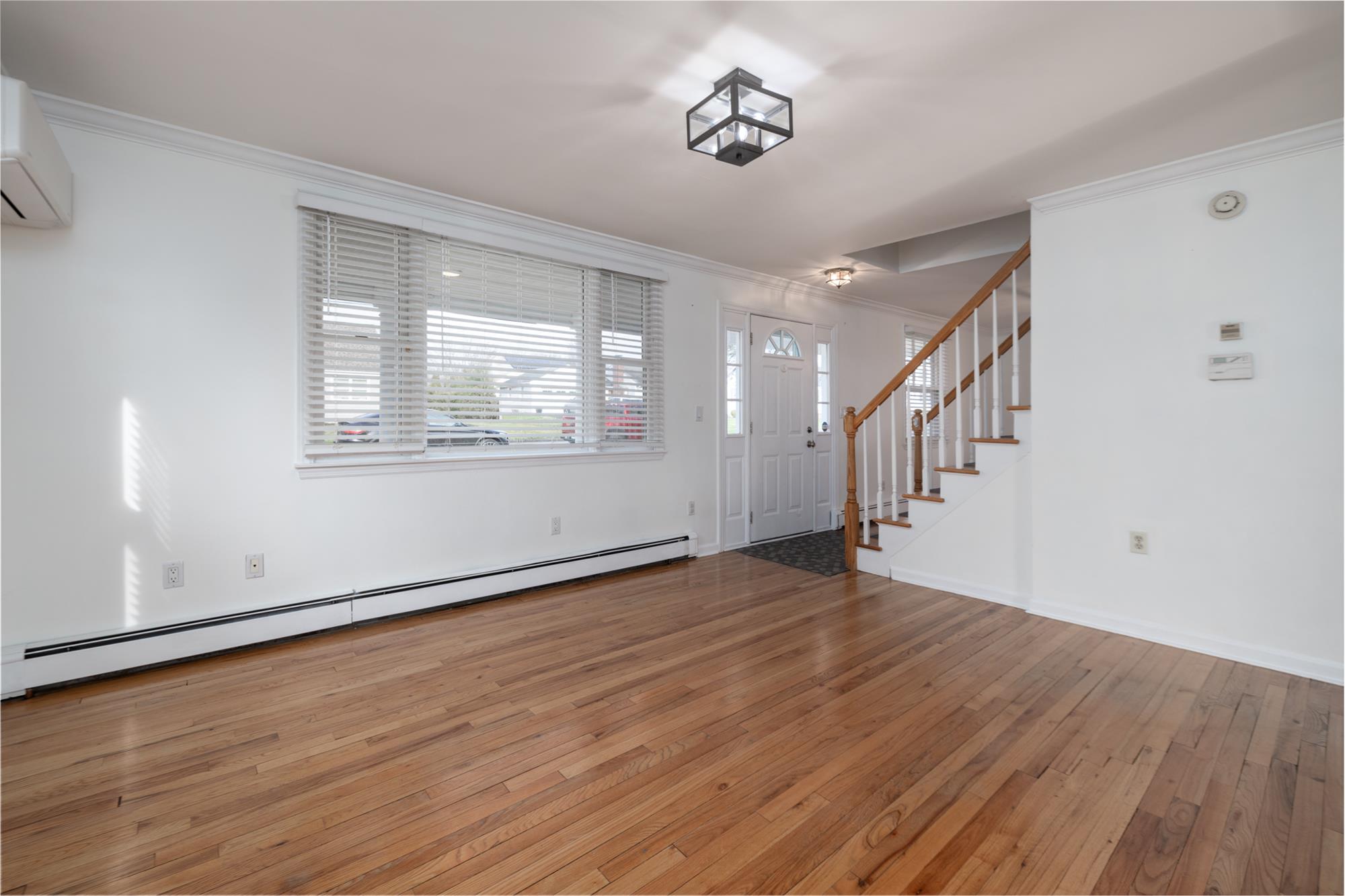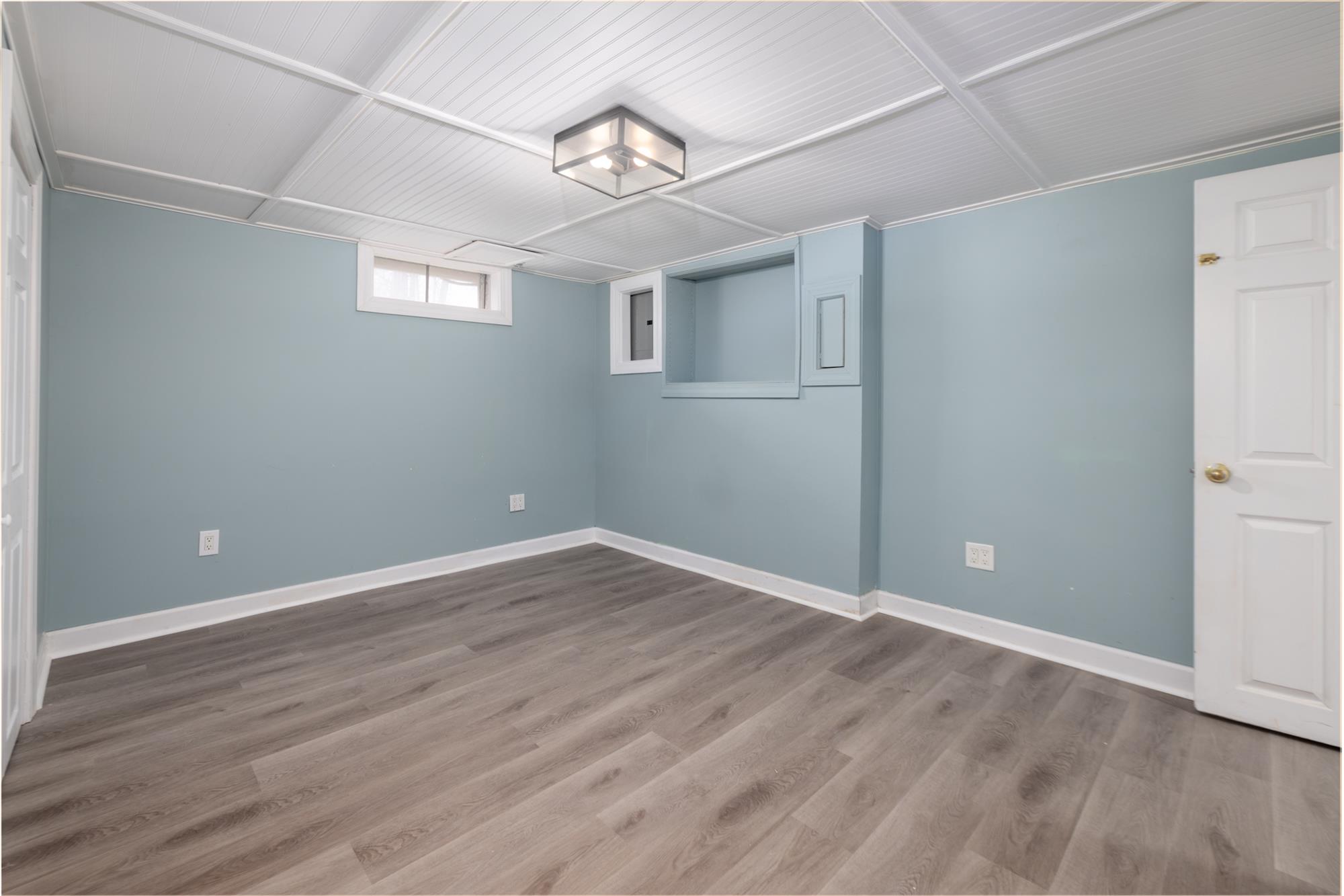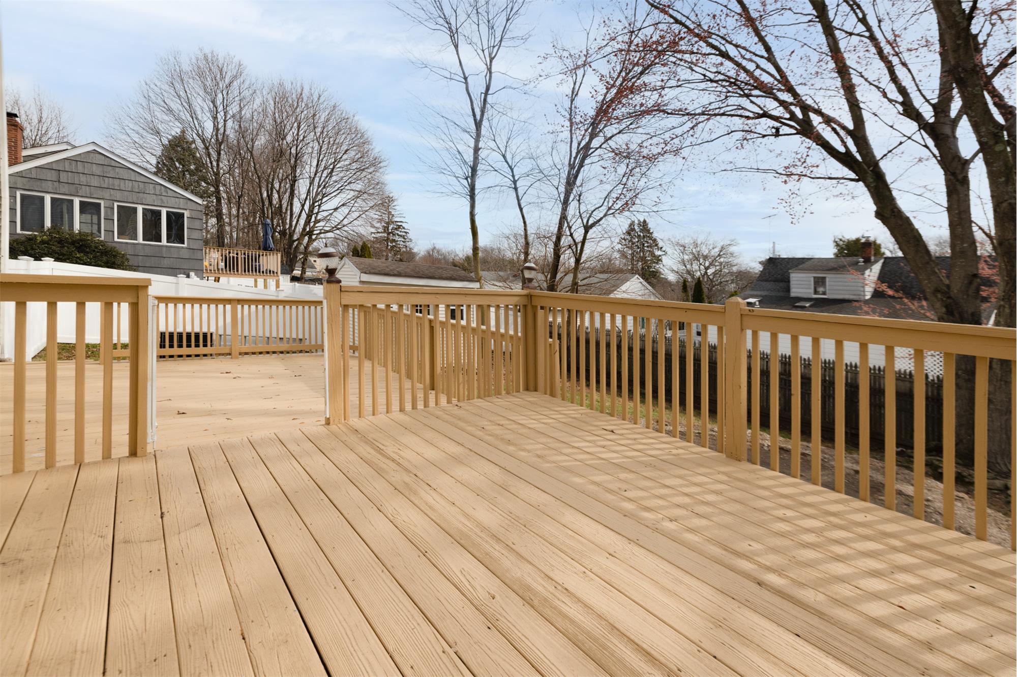 Charming, clean, and ready to move in Cape-style home (fully dormered in back) located on a quiet dead-end street with an oversized driveway offering ample off-street parking. Features a semi-open floor plan with hardwood floors, spacious living room, formal dining room, first-floor bedroom and full bath. The kitchen includes granite countertops, stainless steel appliances, breakfast bar, and plenty of cabinet and counter space. Upstairs offers a large primary bedroom suite with private balcony, generous closet space, and recessed lighting, and full bath with skylight. 3rd bedroom also on the upper level. Fully finished basement provides extra living space, ideal for a family room, and additional office space, along with separate laundry room and ample storage. Enjoy the oversized fenced-in backyard with a large deck, fire pit, and shed-perfect for entertaining. Conveniently located near schools, shopping, dining, and major commuter routes.