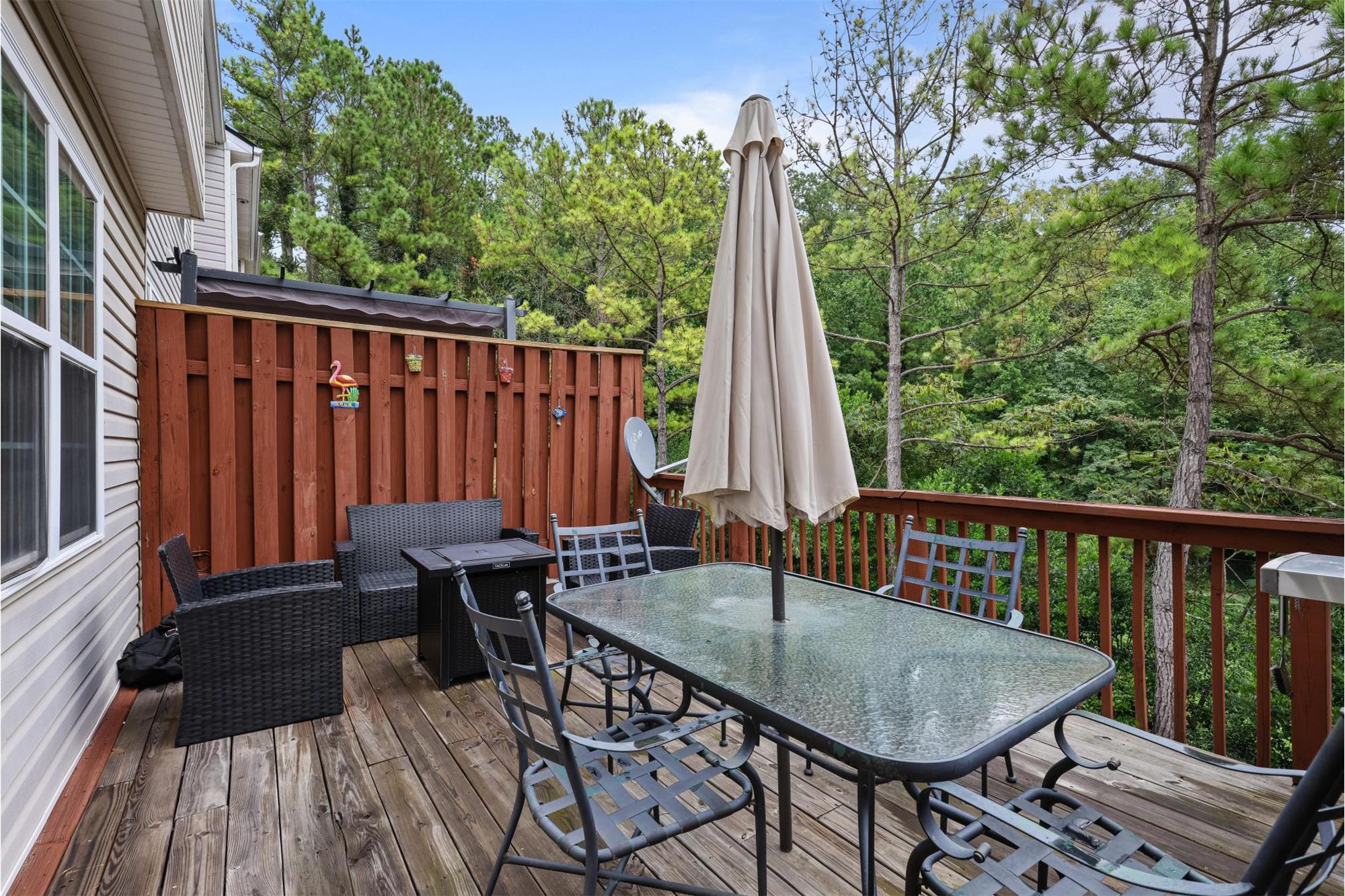 The living room is anchored by a gas log fireplace flanked by stylish floating shelves, creating the perfect ambiance for gathering with loved ones. Step out onto the expansive rear deck, which overlooks wooded green spaceyour own private retreat, ideal for entertaining guests or enjoying peaceful mornings surrounded by nature.