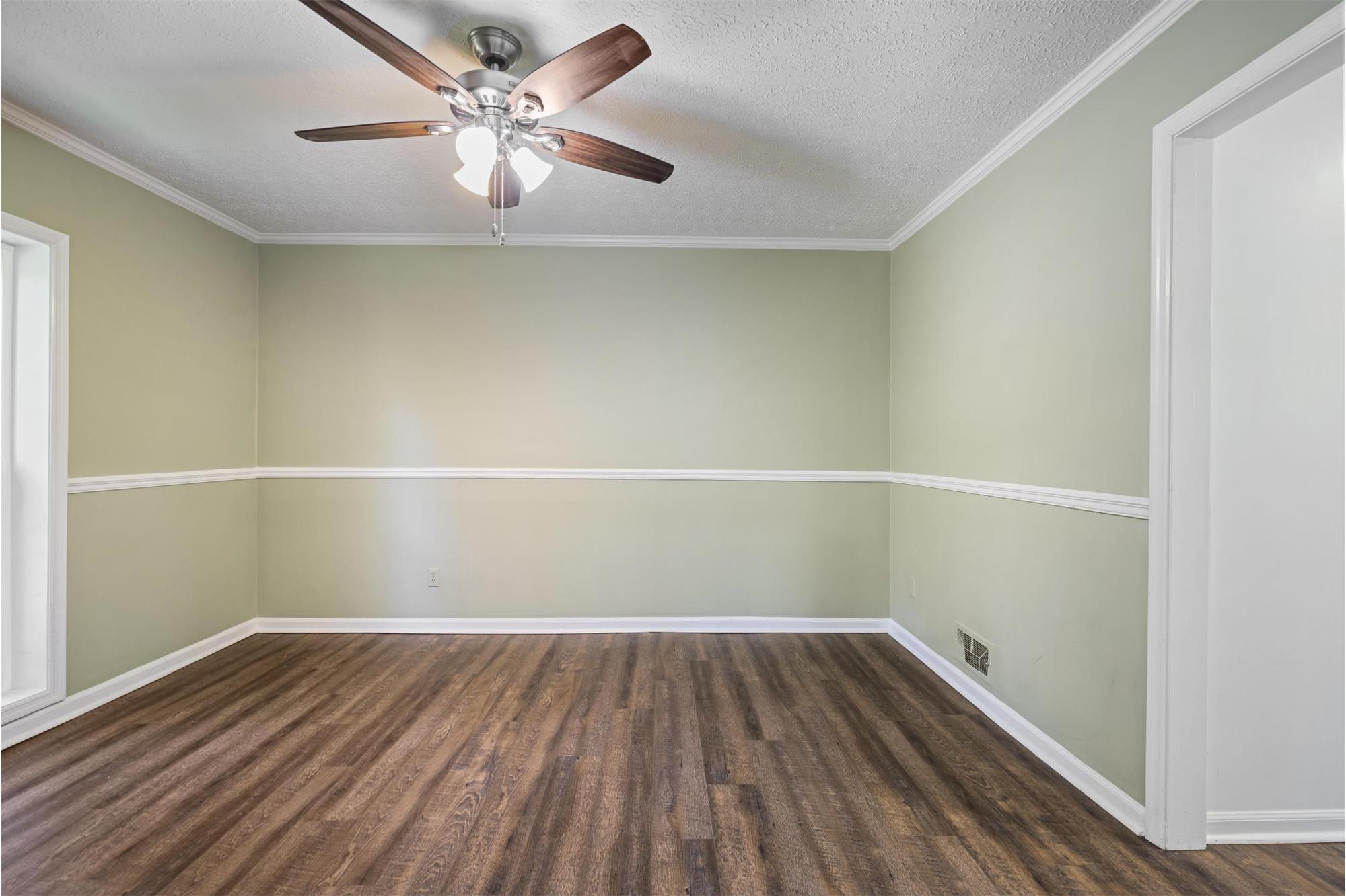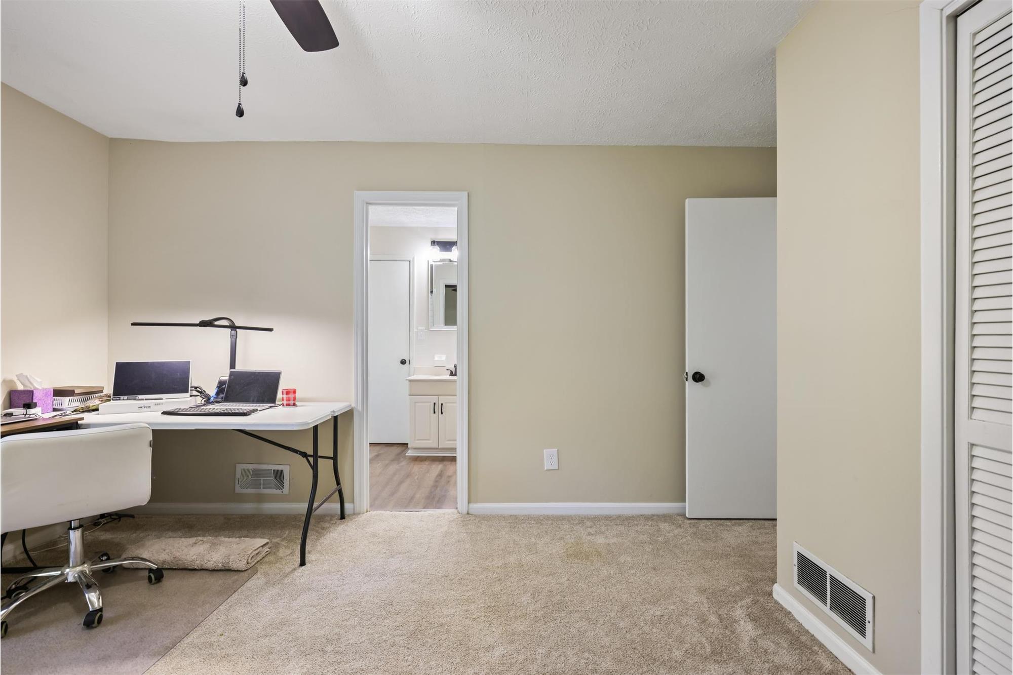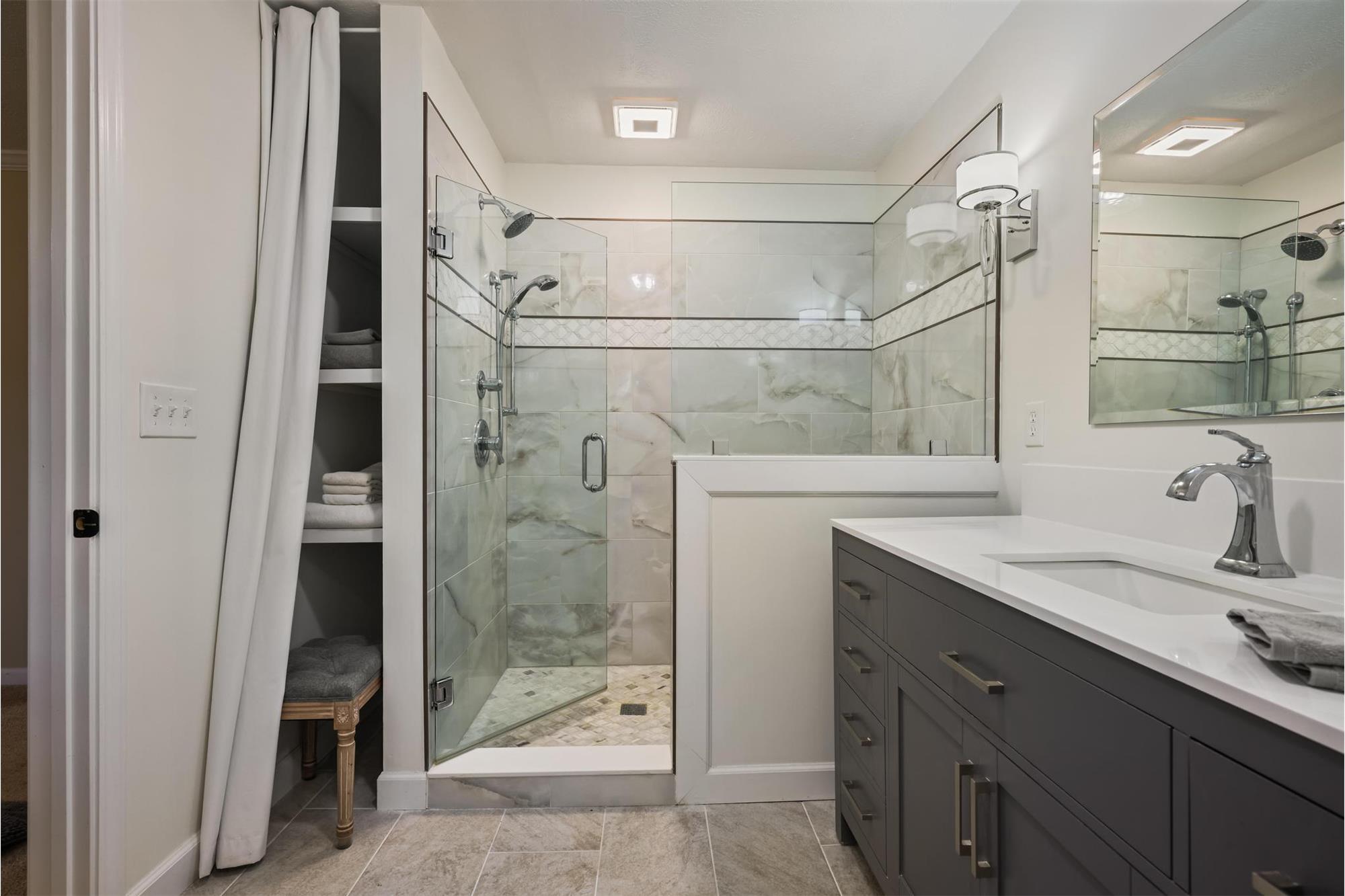 The home includes a den with a brick fireplace and a screened, covered porch at the rear. The generously sized bedrooms feature ceiling fans, spacious closets, and a Jack-and-Jill bath. The primary bedroom is privately situated at the rear of the home and includes a large en suite bath with an expansive walk-in tiled shower, new vanity, updated lighting, and new toilets throughout.