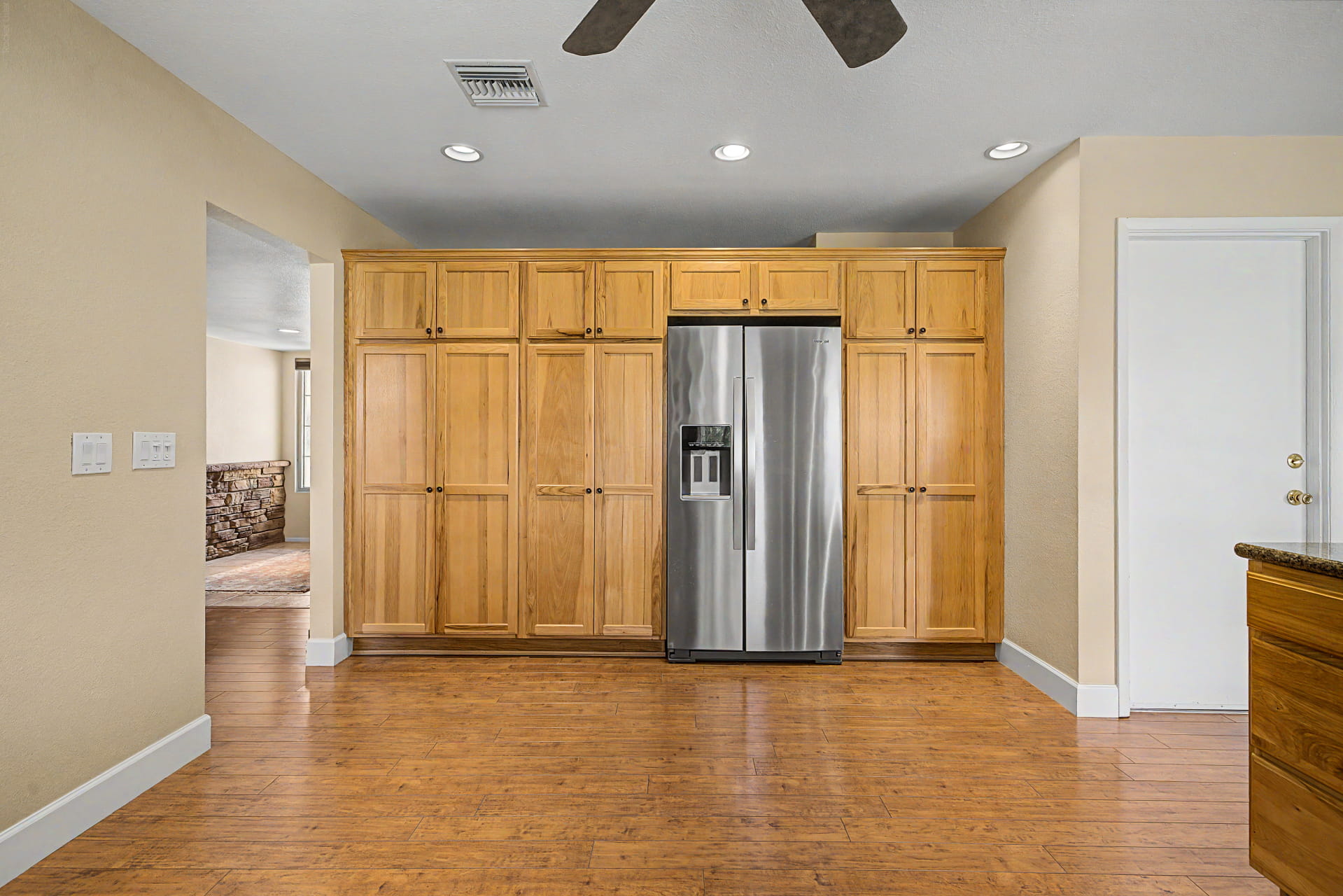 The kitchen features granite counters, a full wall of cabinets with a built-in pantry, stainless appliances, and a large window above the sink that looks out to the golf course and lake. The family room opens off the kitchen and centers on a floor-to-ceiling stacked stone fireplace, with wood-style flooring running through the main living areas and a separate formal living room and dining room at the front of the home. The primary bedroom includes a dual-sink vanity, a walk-in shower, and a walk-in closet.