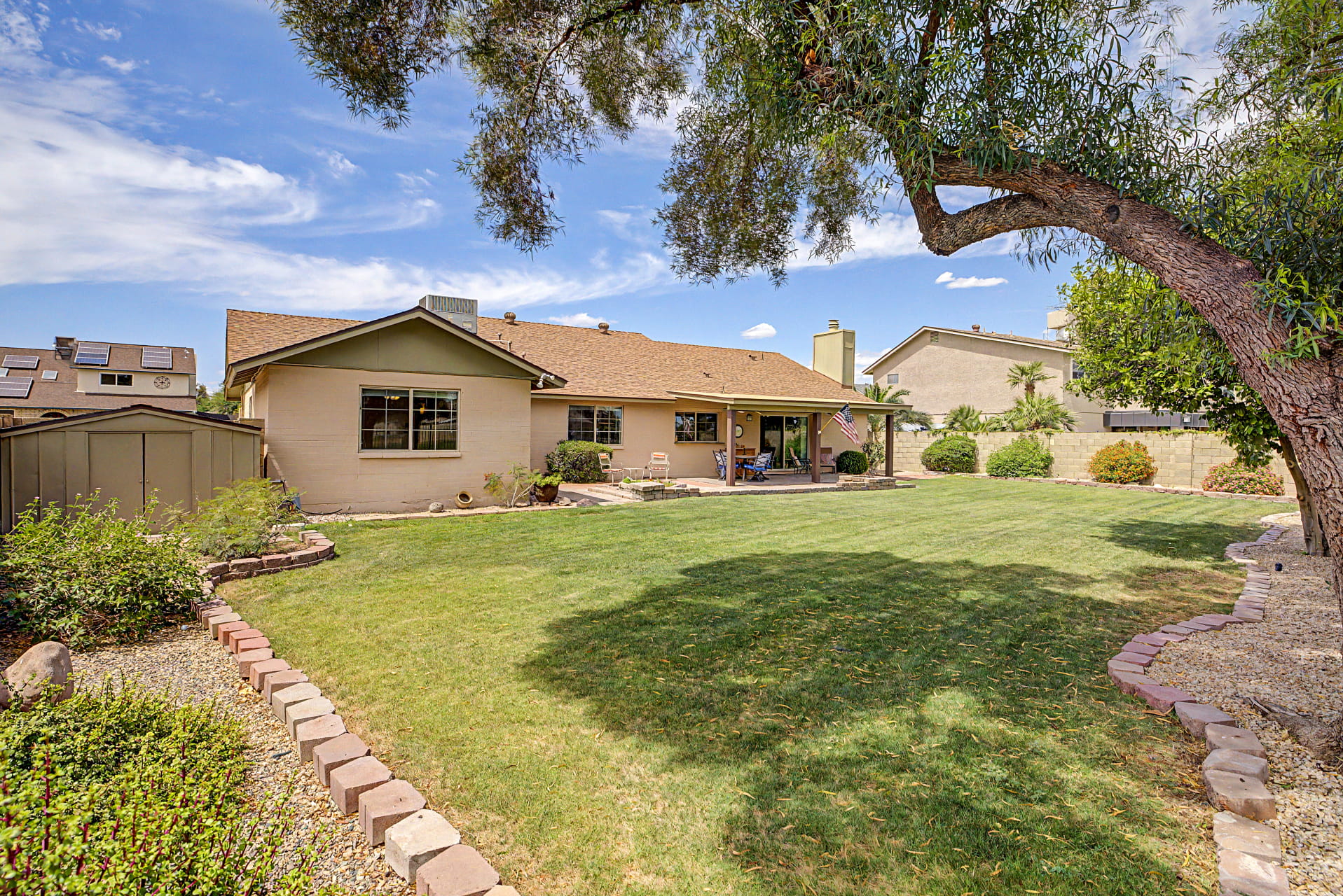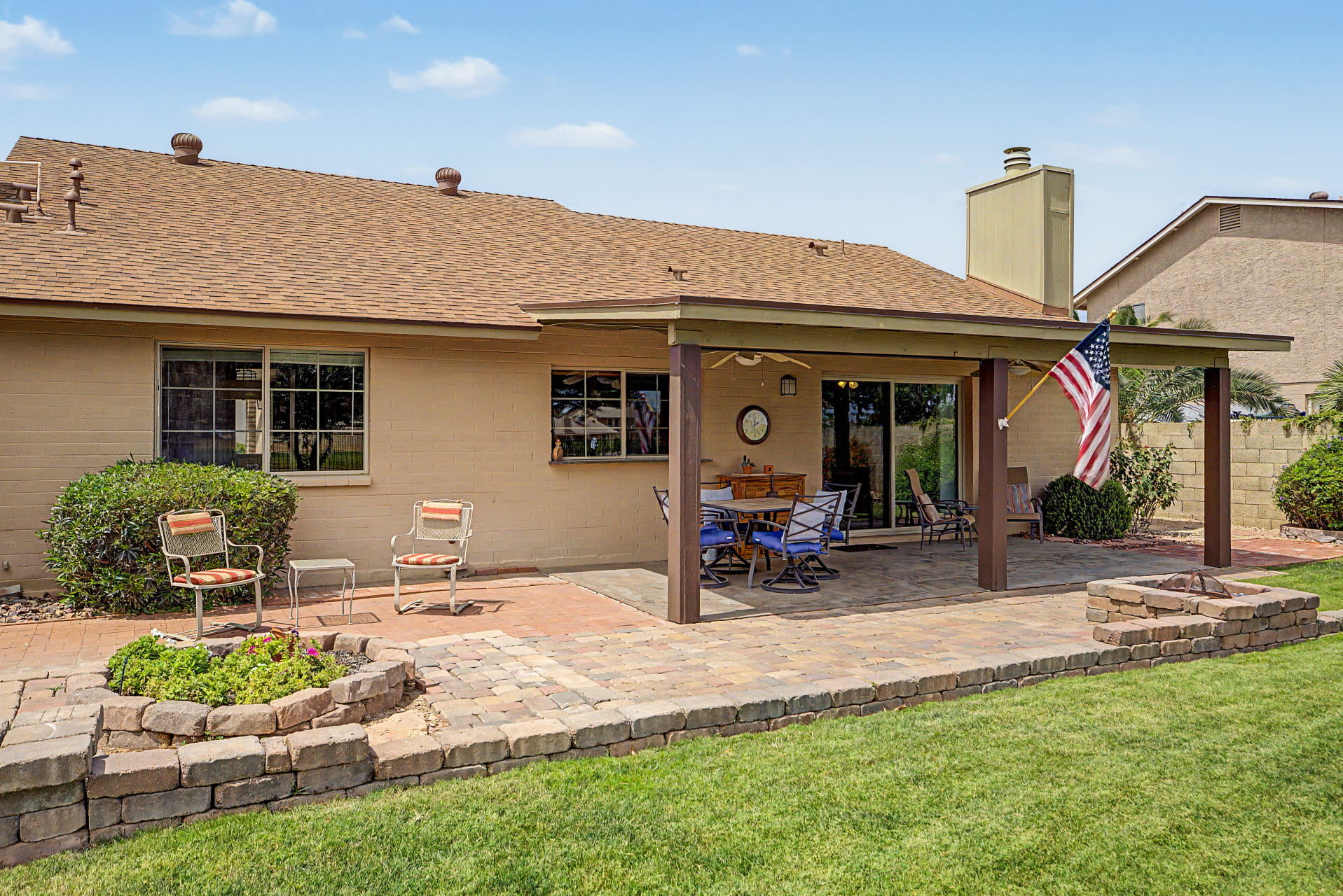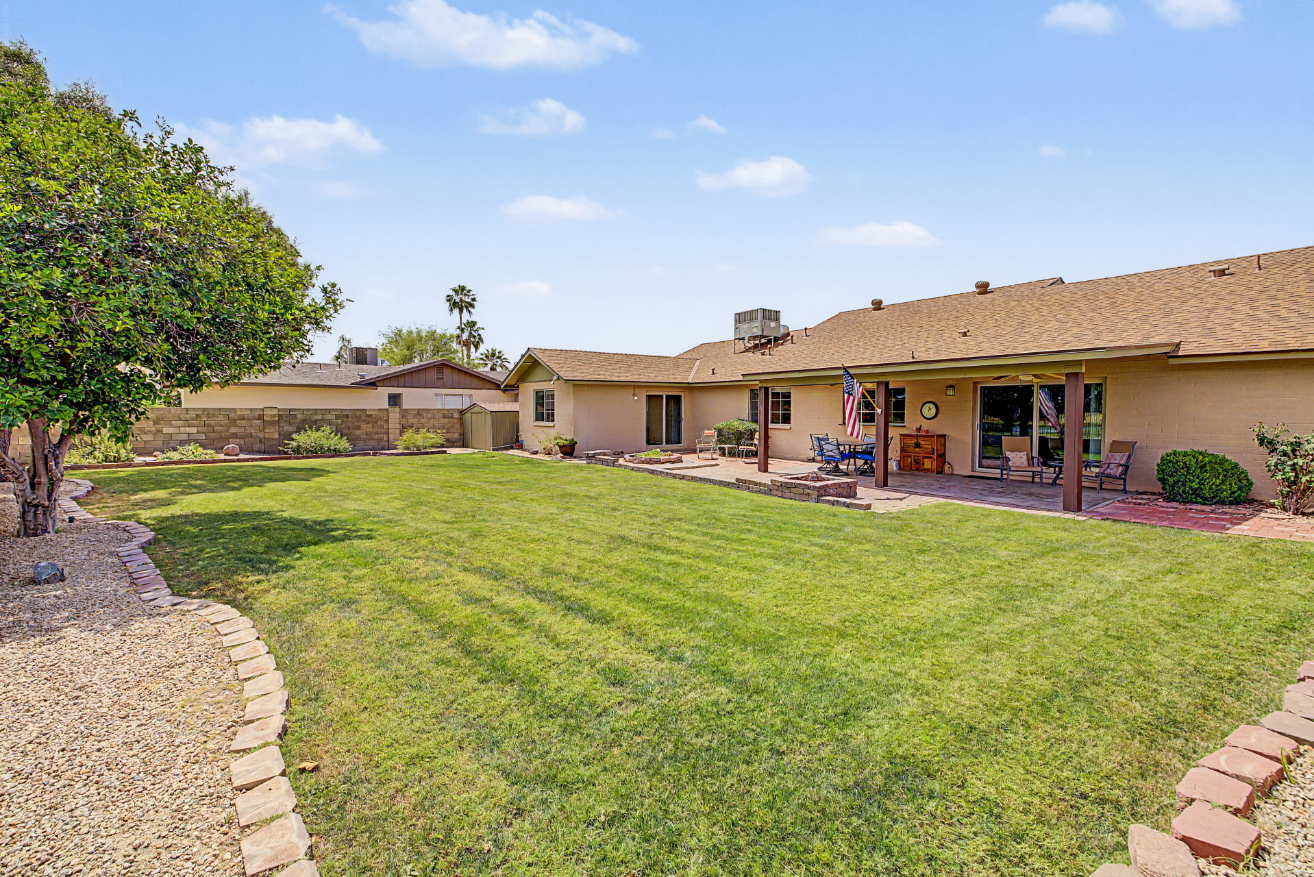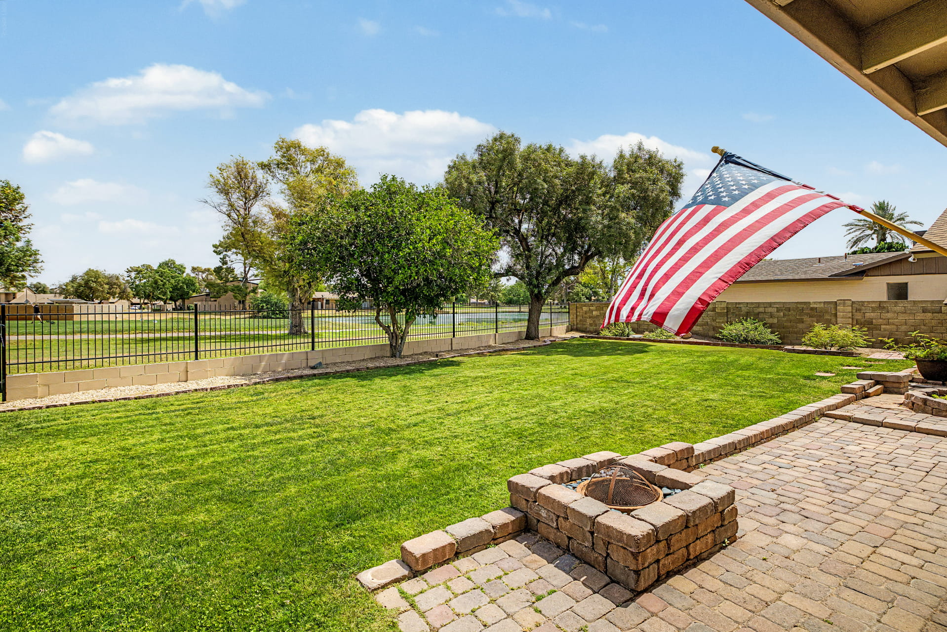 The backyard is where this lot really stands out. The covered patio opens onto a paver area with a built-in fire pit, with plenty of grass beyond it and mature trees for shade. A wrought iron fence keeps the views wide open across the fairway to the lake, so the yard feels more like part of the course than something closed in.