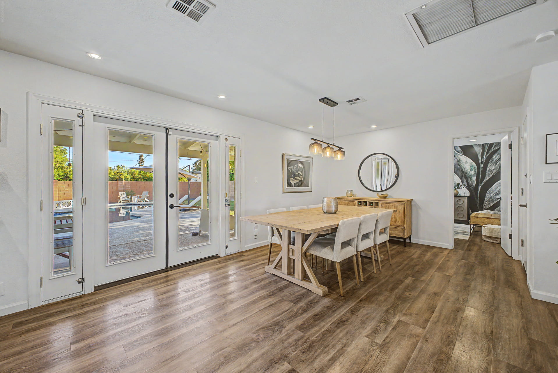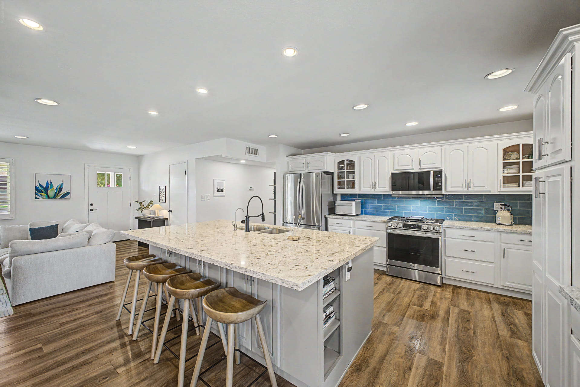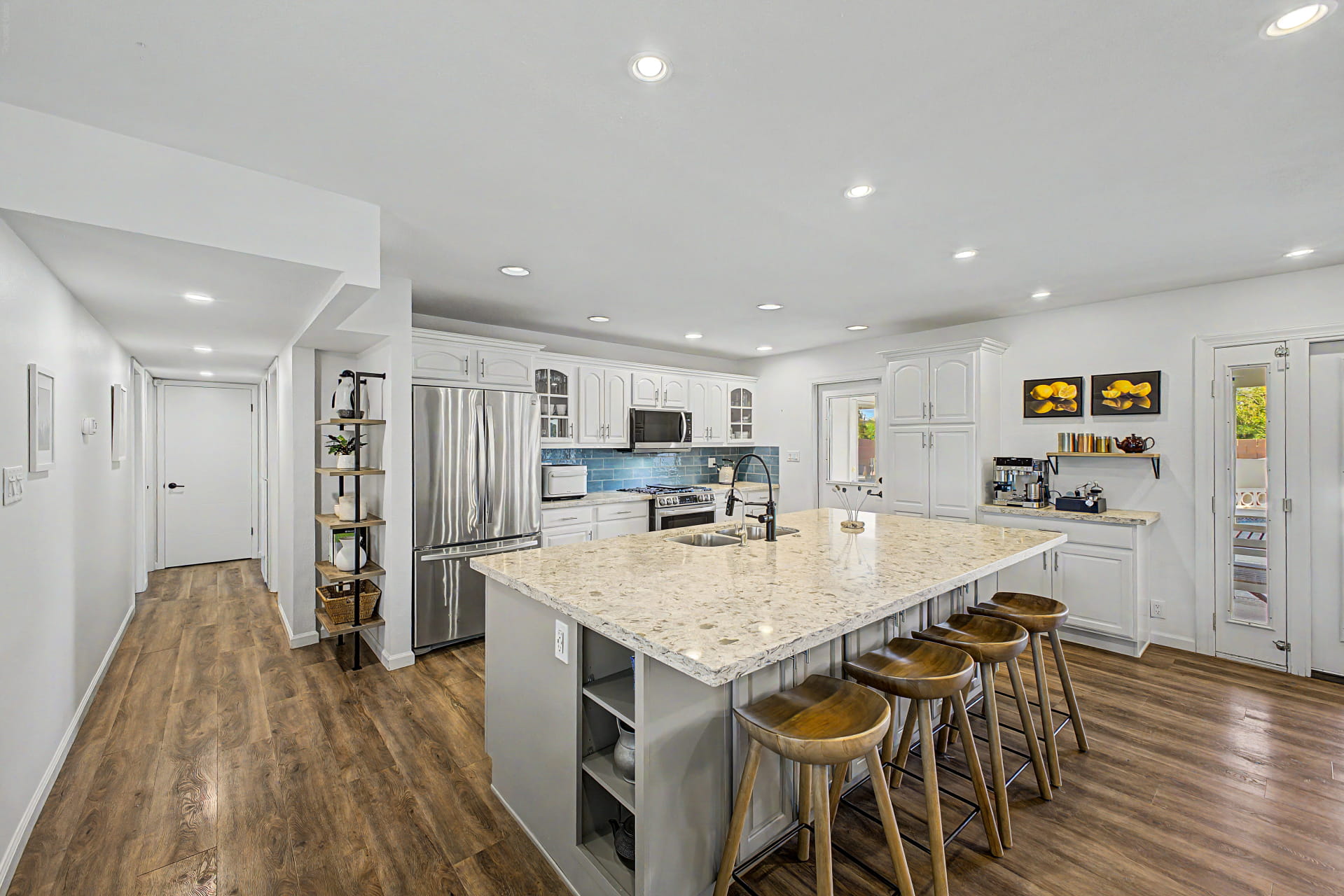 The interior feels bright and open, with a layout that works well for both everyday living and entertaining. Thoughtful updates throughout include new Marvin windows, a new slider, plantation shutters, recessed lighting, and all new interior doors and hardware. The primary bathroom has been fully updated with a frameless shower, new tile, a new vanity, and updated backsplash. The separate den functions easily as a fourth bedroom, home office, or flex space depending on what the household needs.