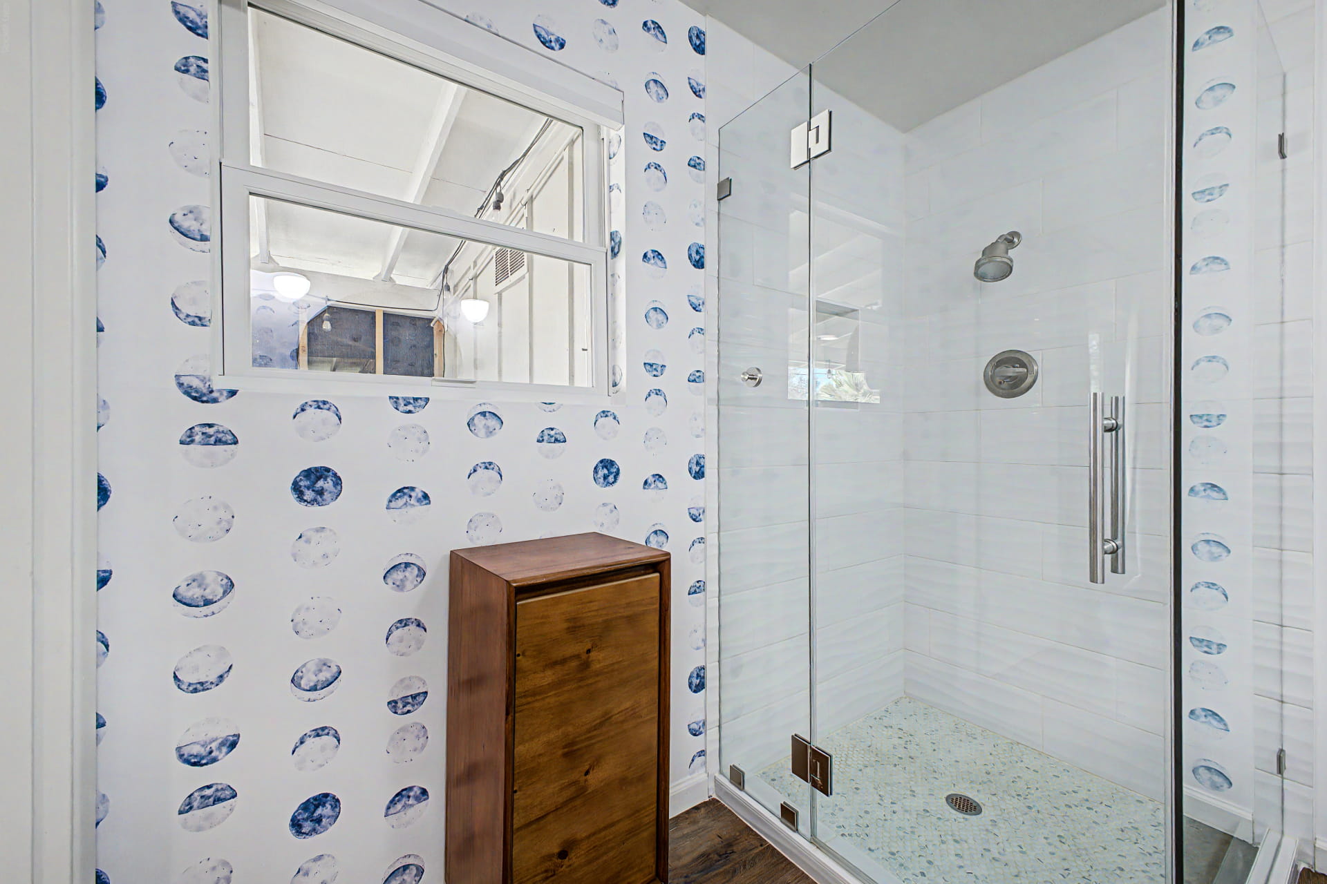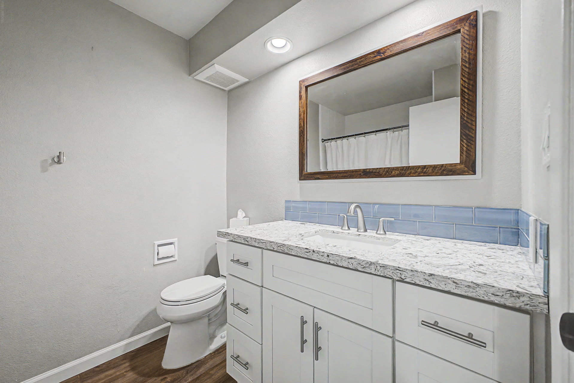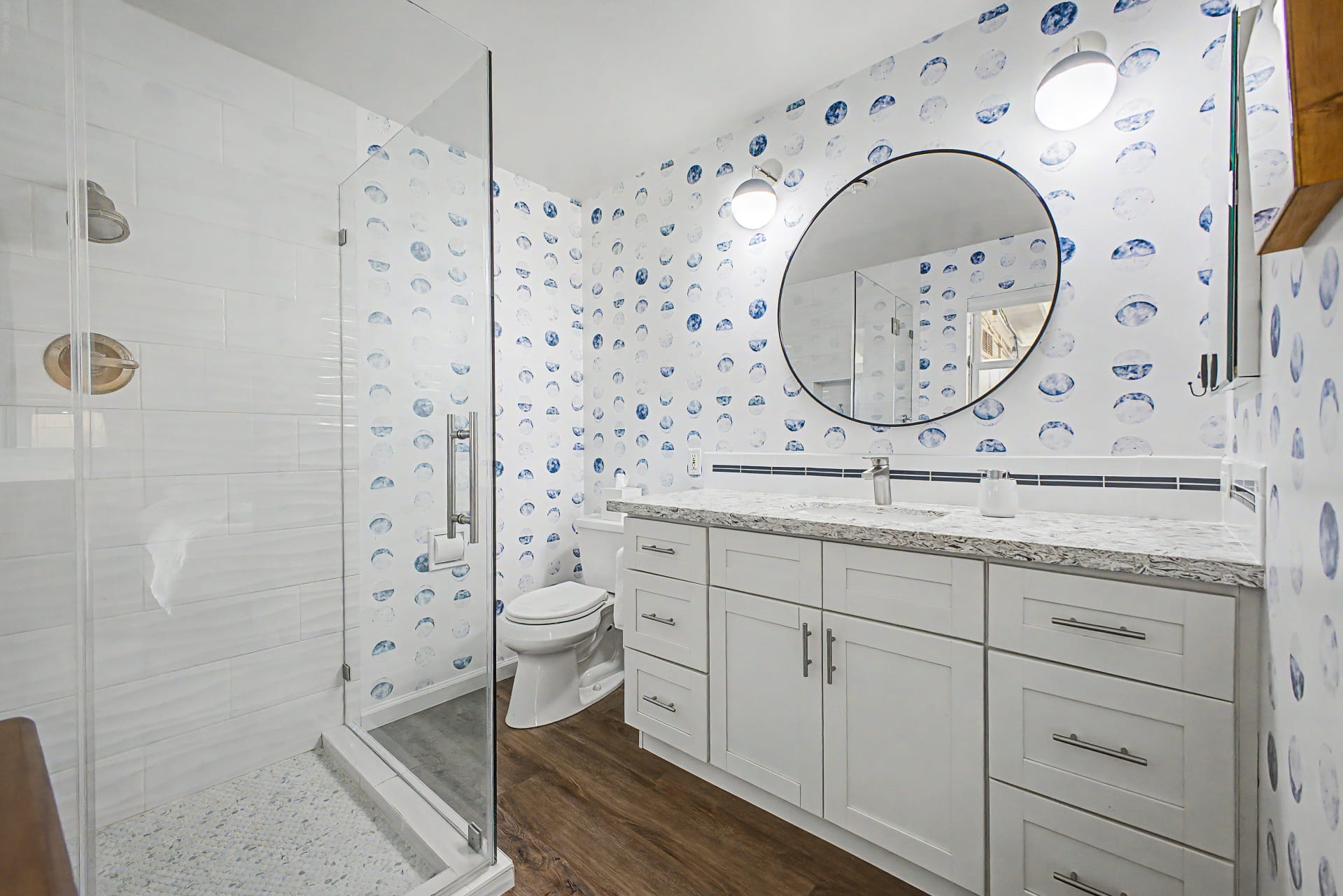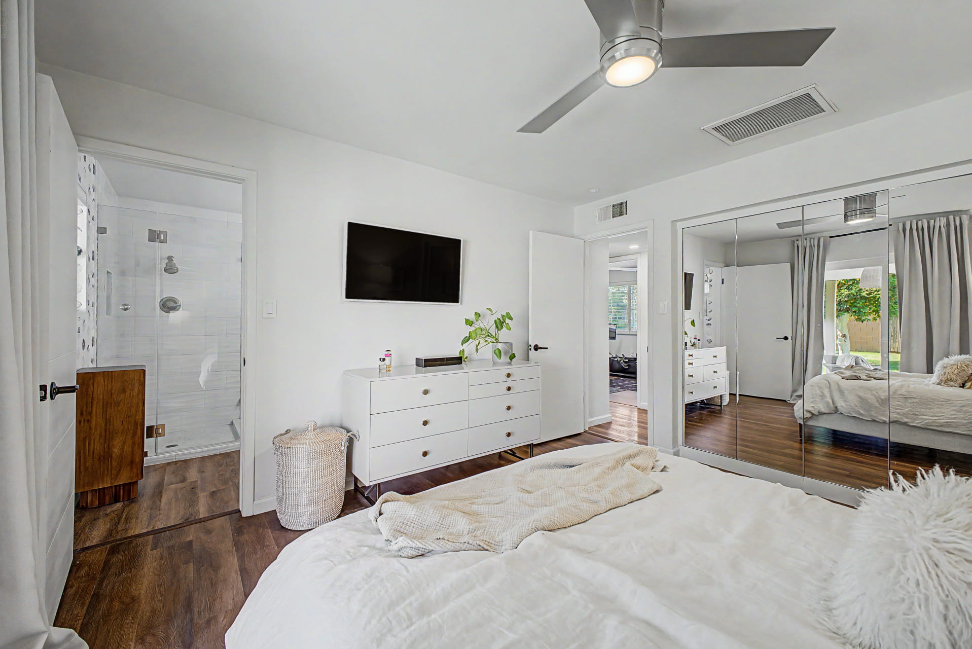 Fully updated primary bathroom with frameless shower and new vanity
