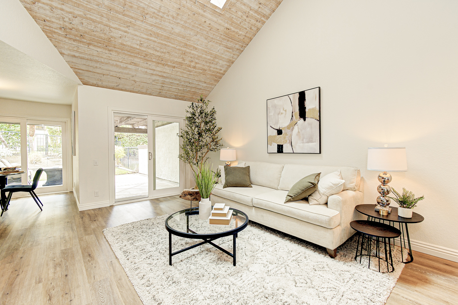 enhancing the beautiful wood ceilings. The skylights, windows and sliding glass doors flood the home with natural light. A travertine floor entryway leads into the