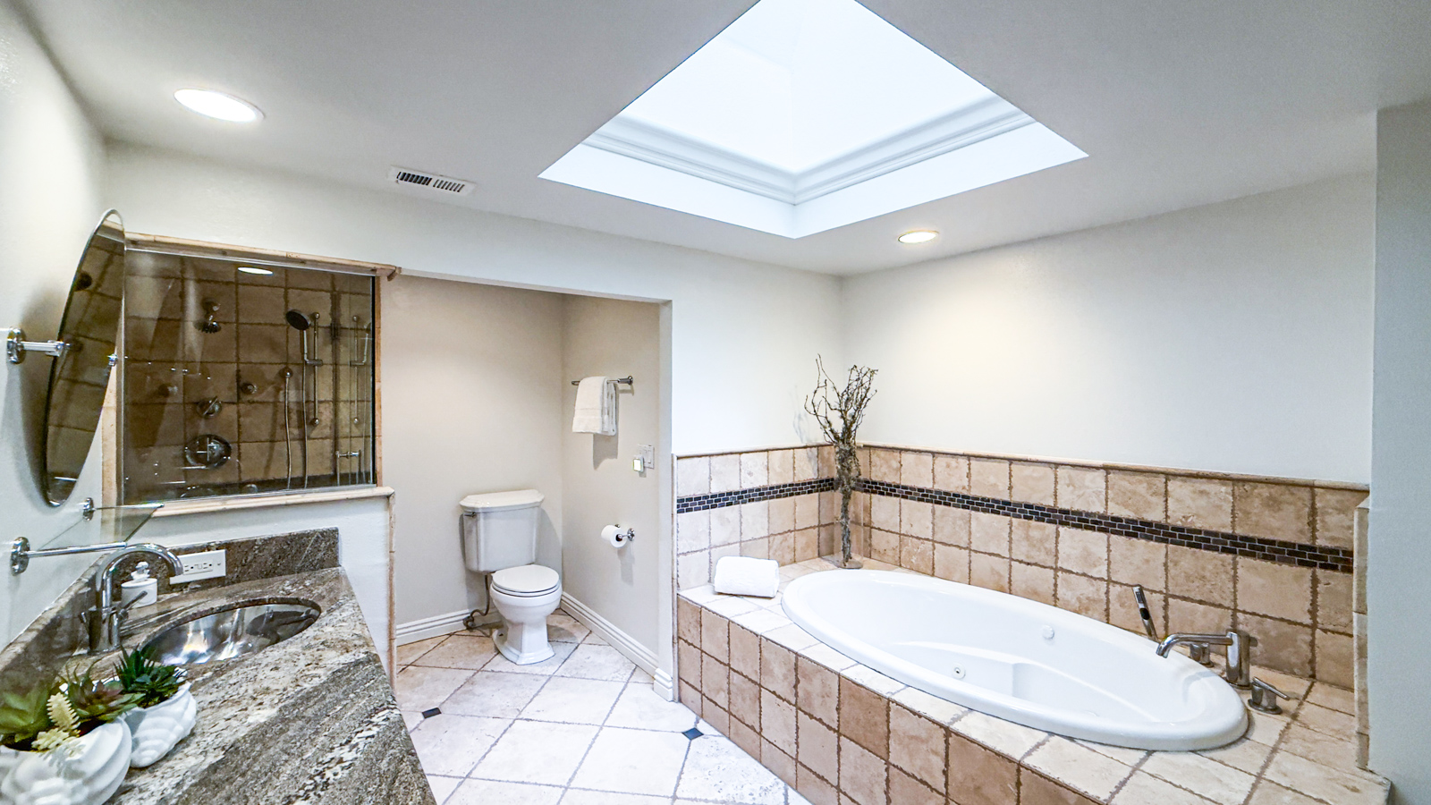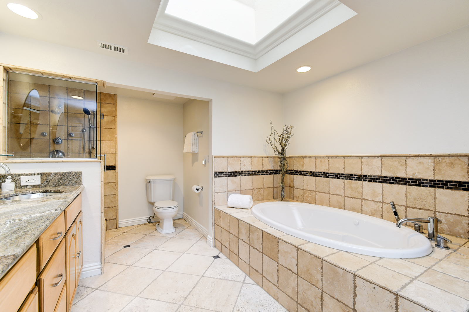 primary suite bathroom boasts a skylight, jetted tub, walk-in shower with glass door, dual vanities, granite counter, travertine flooring, and closet space. The