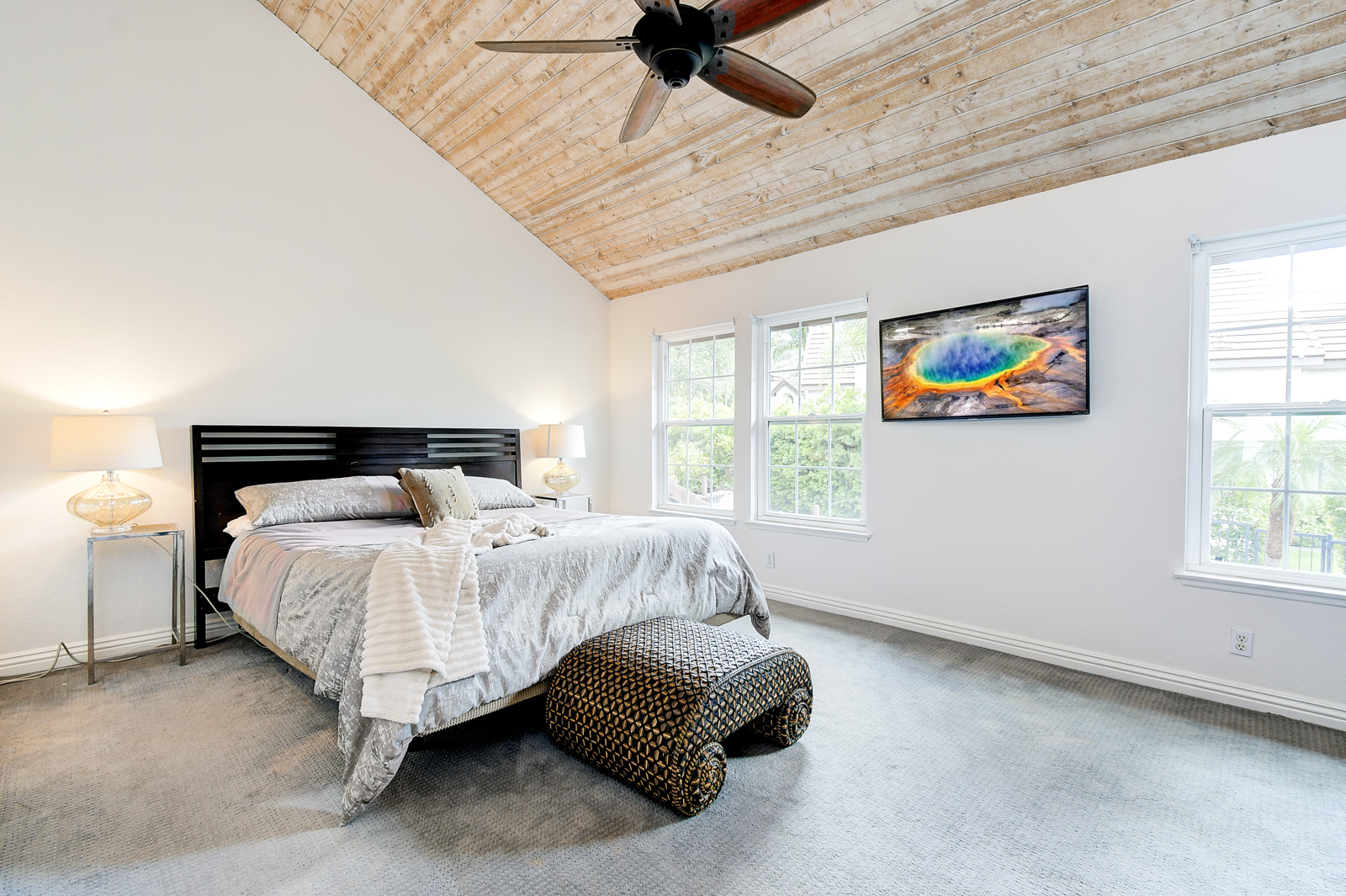 second bathroom suite features a walk-in closet, travertine flooring with custom glass walk-in shower. Both bedrooms have ceiling fans, vaulted ceilings and lots