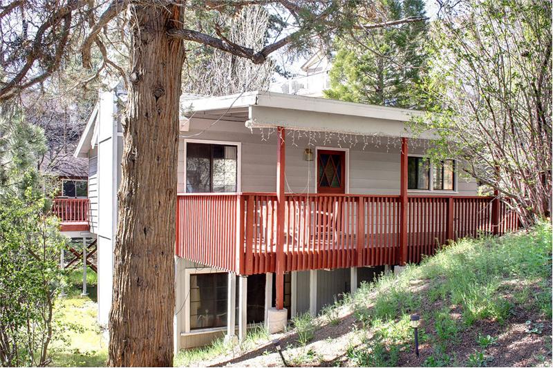 Fantastic Moonridge location with peek-a-boo ski slope views, beautiful treed setting, and minutes to Bear Mtn! Two bedrooms + large bonus room 2.75 baths Approx 1,290 sq. ft. of living area Approx 6,300 sq. ft. lot Two large decks Additional access from easement at rear of property The perfect getaway - in a perfect Moonridge location, just moments from Bear Mtn skiing and golf, and minutes to the lake, marinas, Village and shopping areas. Two-story plan features large entry-level living area with high vaulted wood T&G ceilings and wood beams. Warm wood paneling for a nice “mountainy” feel. Used brick fireplace with seating hearth; big windows for enjoying the treed views! Dining nook, plus breakfast bar seating at kitchen for casual dining. Lots of storage in oak cabinets, tiled countertops. Nice valances, blinds and draperies throughout. Newer roof and forced-air unit. Large master bedroom with mirrored wardrobe doors, ceiling fan, and private bath, on main level. Additional guest bedroom and bath on main level. Lower level offers spacious bonus room with second brick fireplace, wood T&G ceilings with beams. Great space for family or game room, or additional sleeping area. 3/4 bath and laundry on lower level as well. Plenty of room for family and friends!