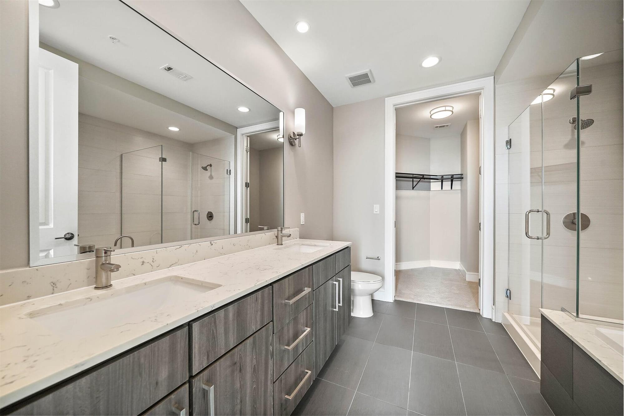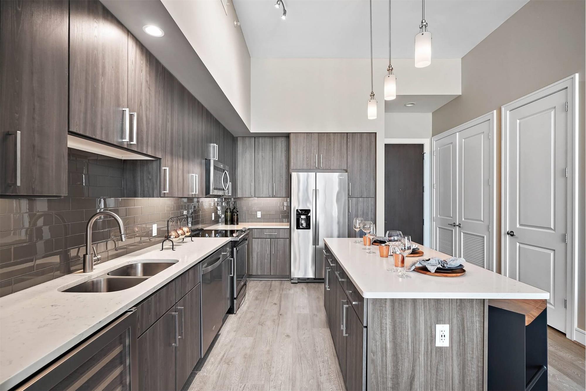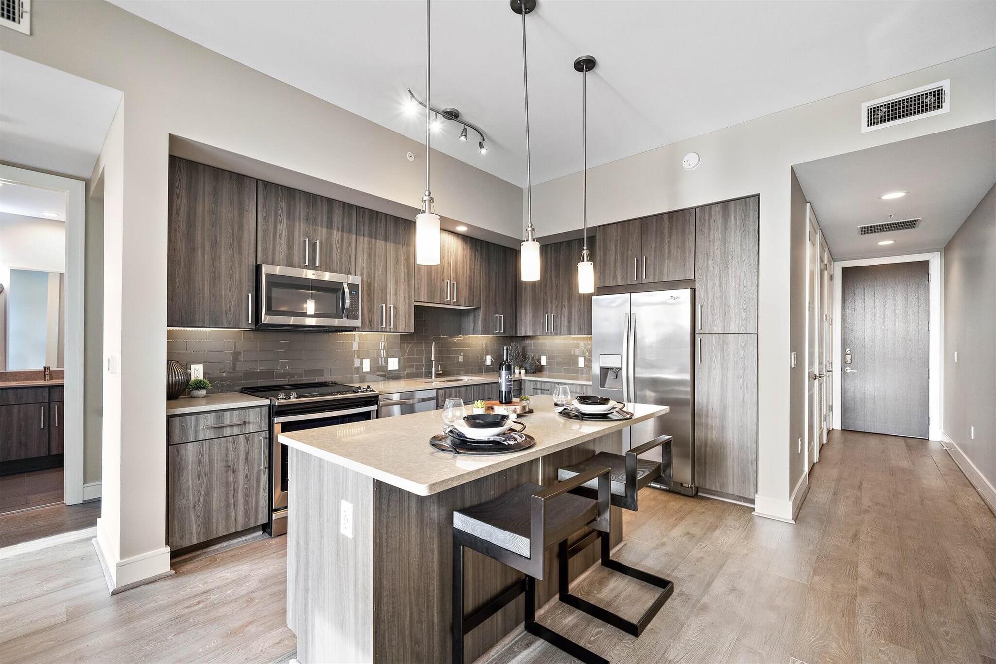 The gourmet kitchens have quartz countertops with spacious cabinets, under counter lighting and sleek stainless steel appliances.