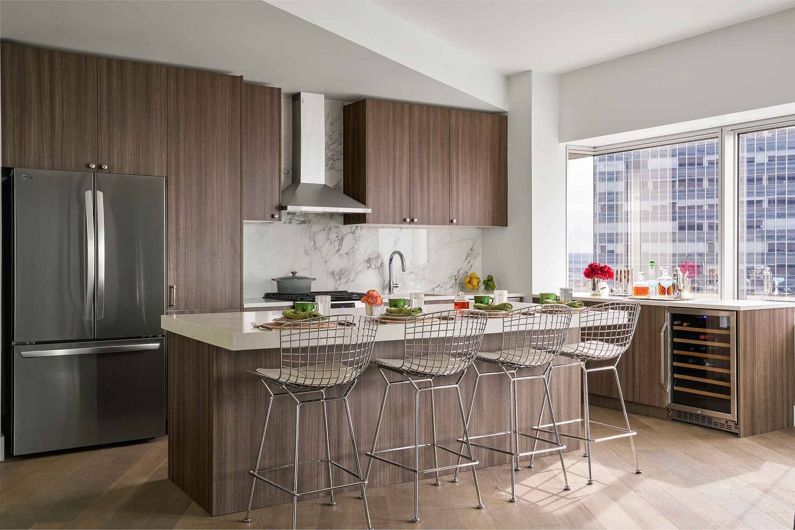 Open concept dining areas with wine chillers and hospitality bars