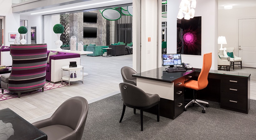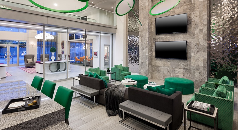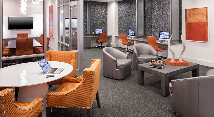 Swanky clubroom with lounge seating and TVs