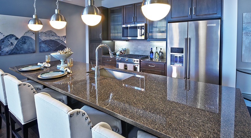 Custom cabinetry with 42” upper cabinets and glass front displays