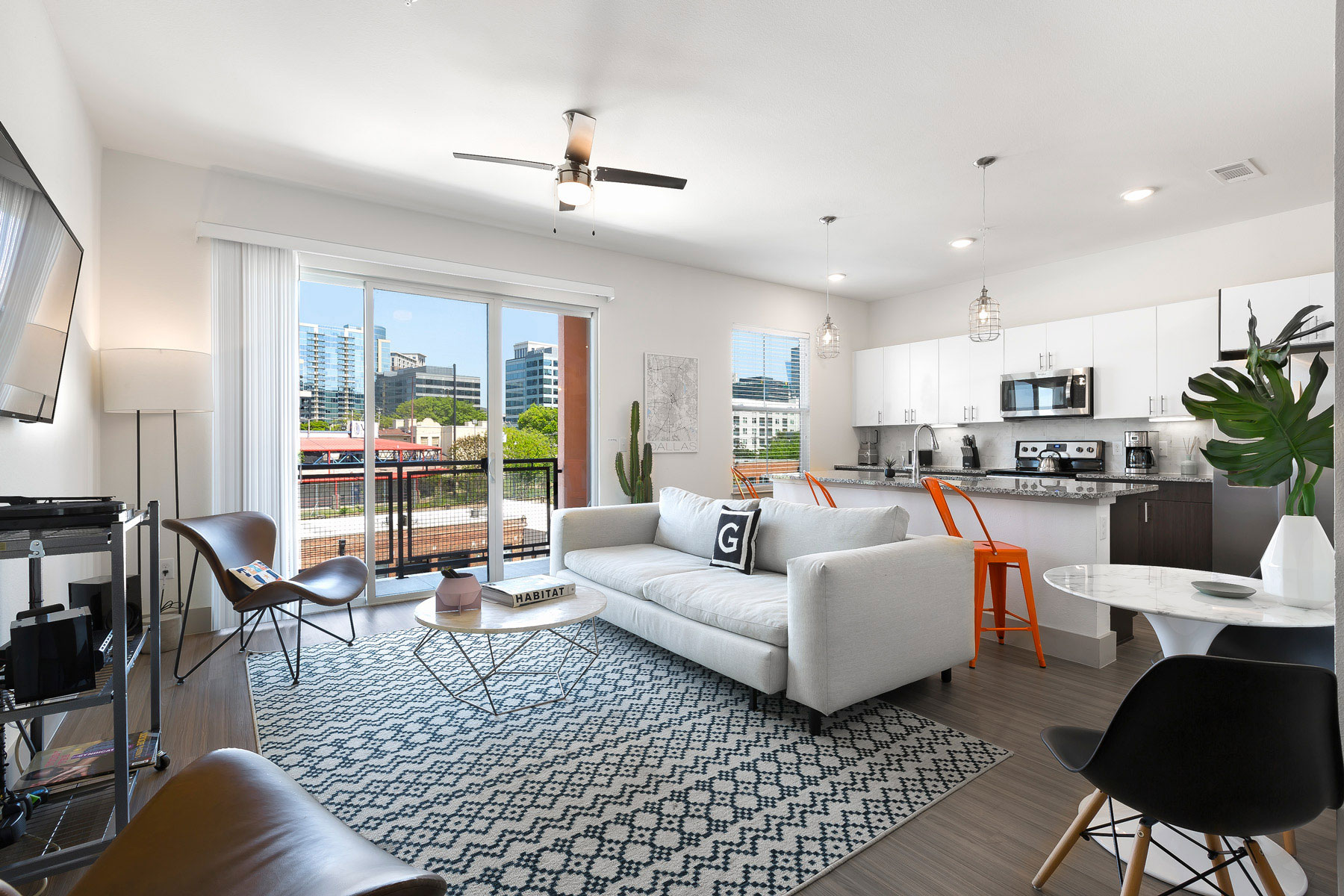 Rooftop lounge with views of Victory Park and Downtown Dallas
