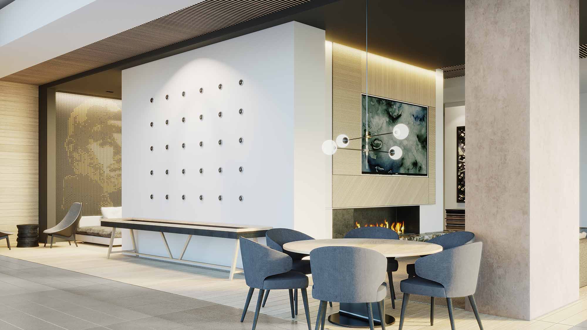 Gaming lounge featuring TrackMan golf simulator and fireplace