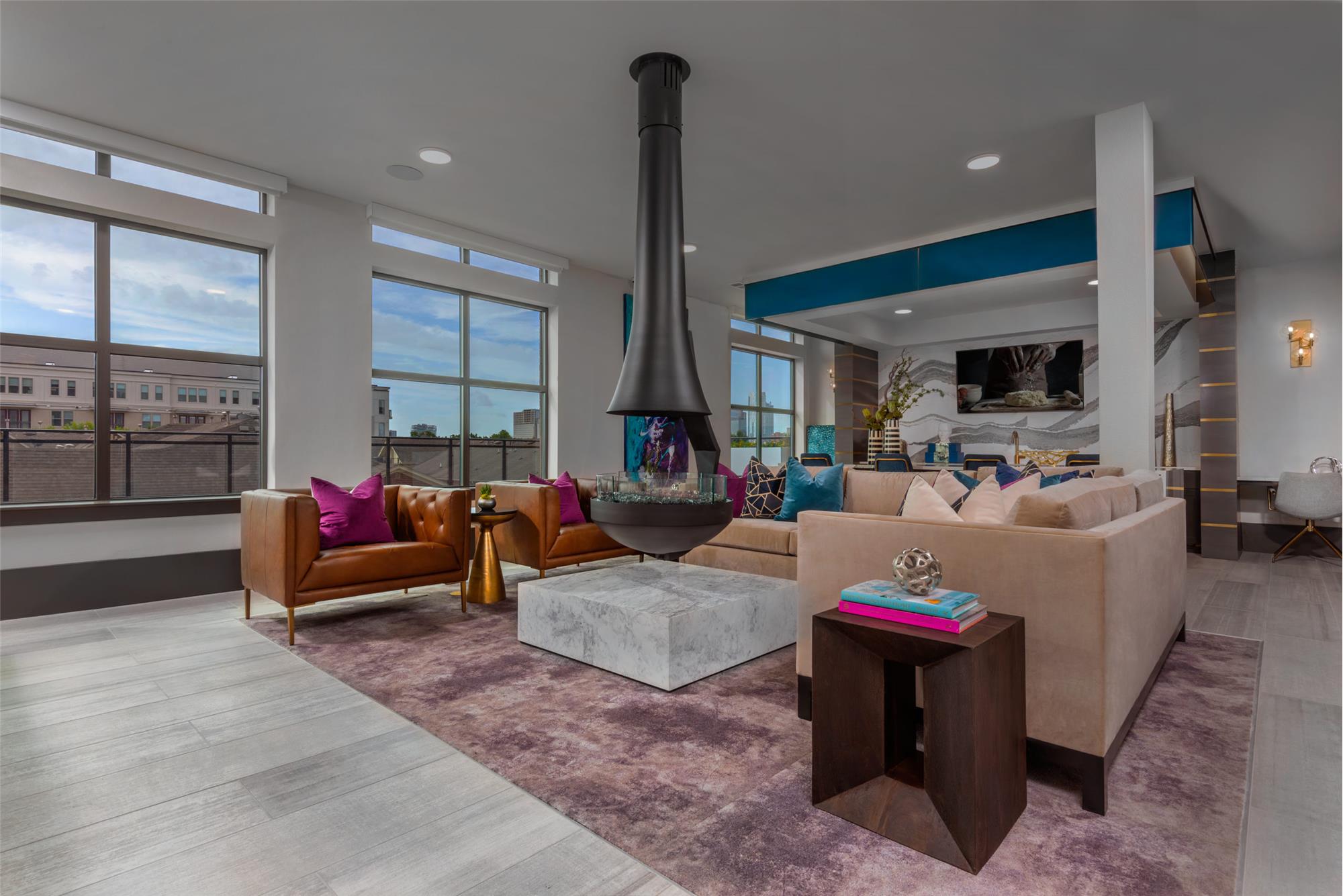 Entertain guests in the clubroom with views of the pool, TVs, suspended fireplace, a full kitchen, coffee bar, billiards and shuffleboard