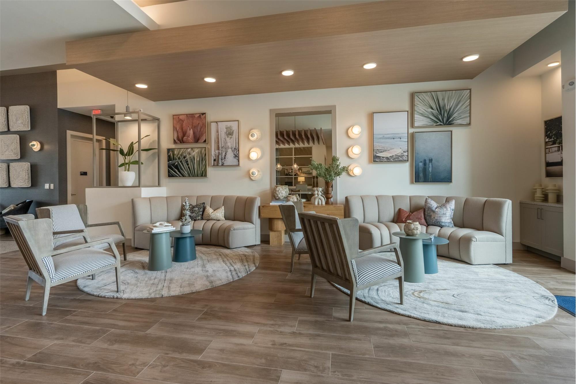 Social clubroom with kitchen, plush seating, & TVs