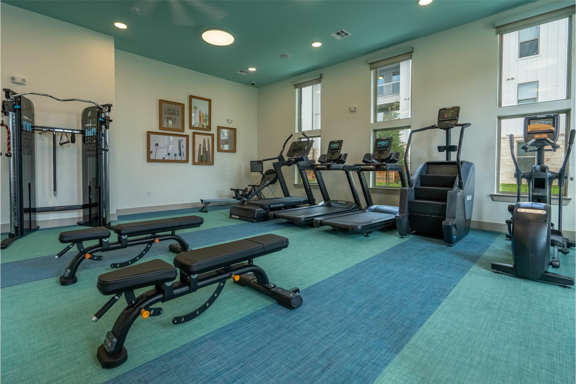 24/7 fitness center with superior Precor, Echelon, Freemotion & Stairmaster cardio theater equipment featuring touchscreen, television & tech connectivity, exceptional Precor weight stations, & the Escape Quad that includes uncompromising conditioning equipment such as Medicine Balls, Slam Balls, Free Weights, TRX, & Battle Ropes