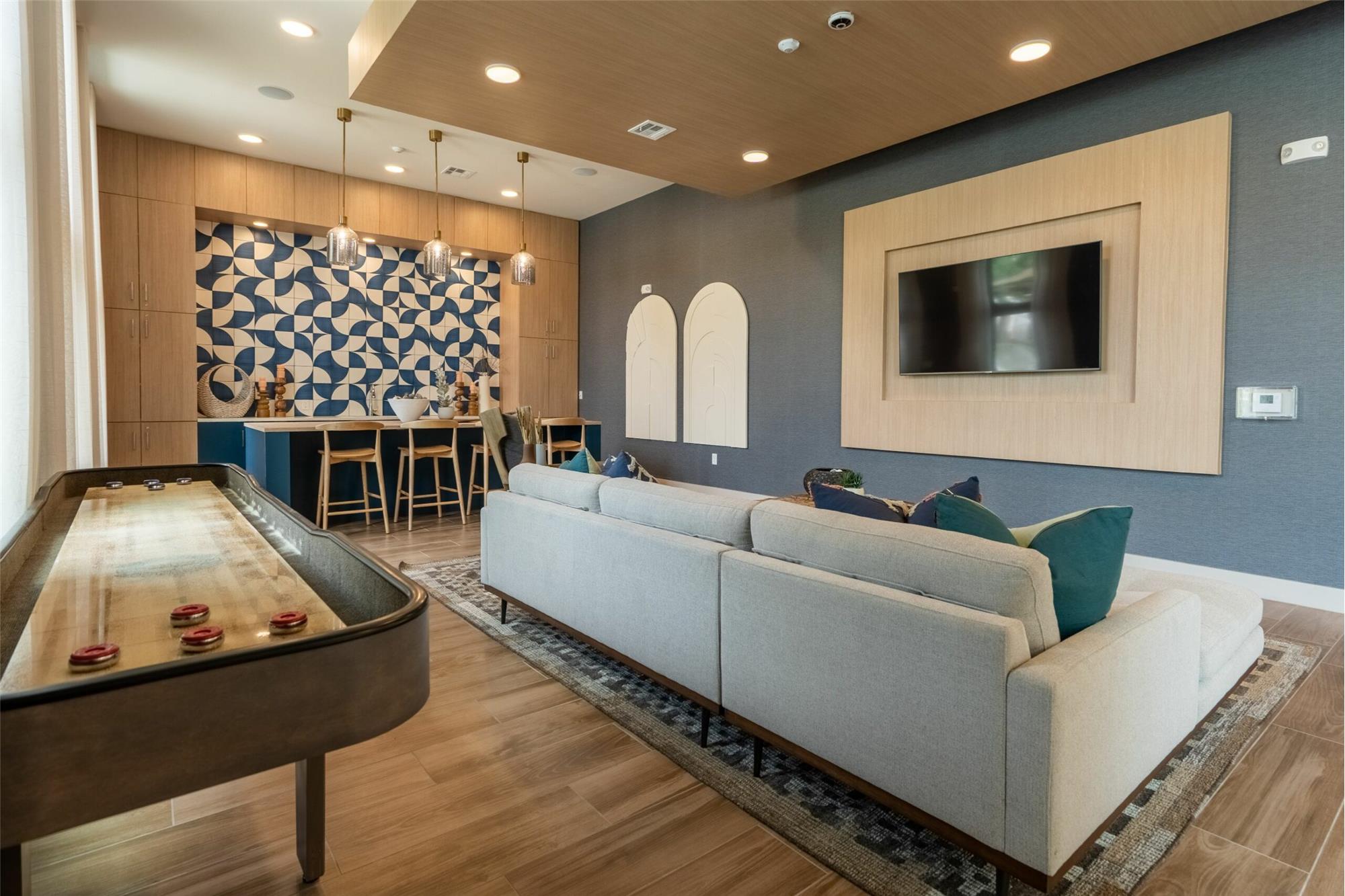Social clubroom with kitchen, plush seating, & TVs
