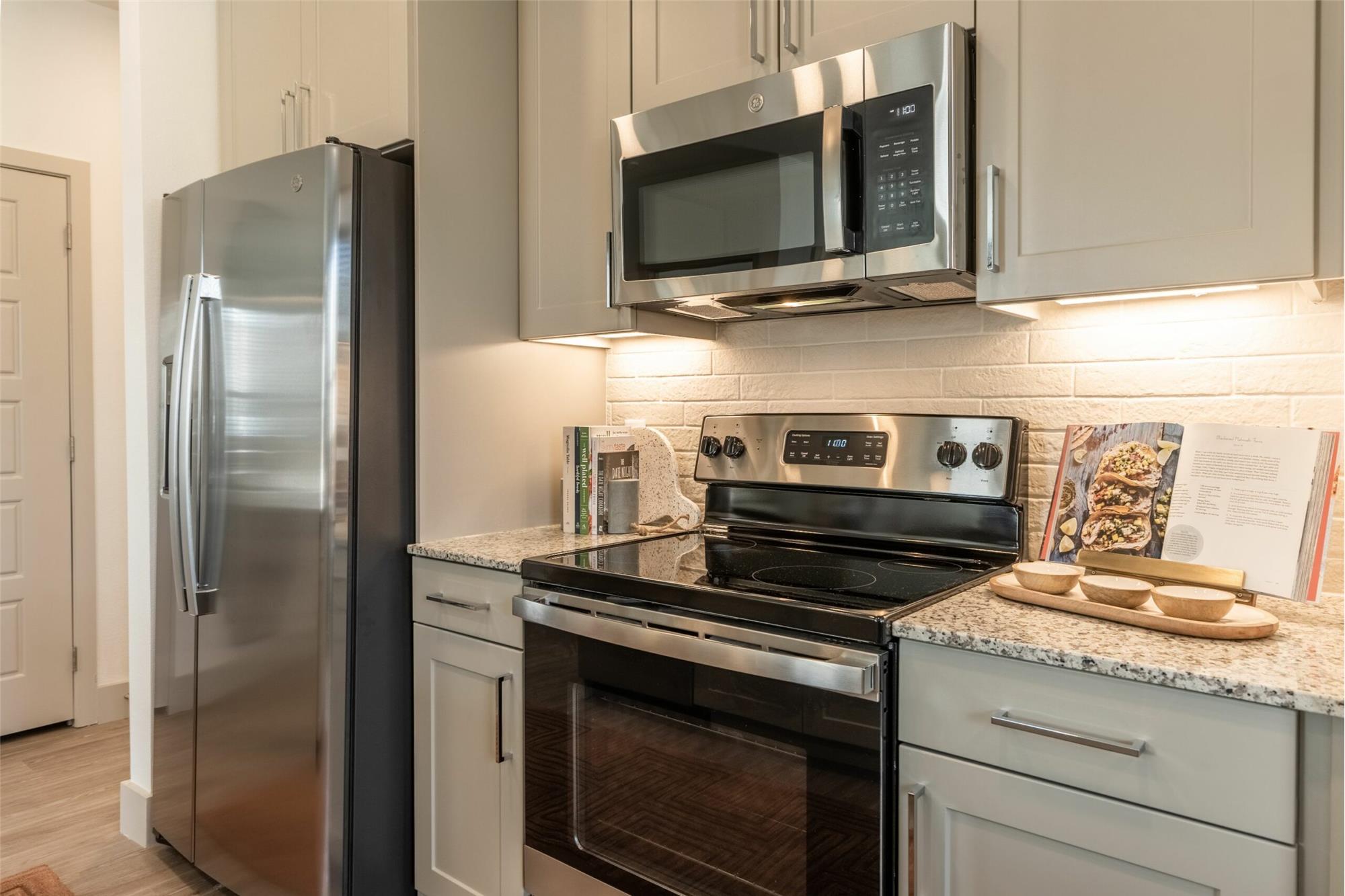 Stunning kitchen with 42” custom cabinets featuring luna pearl granite countertops, undermount sink, & designer ceramic tile backsplash