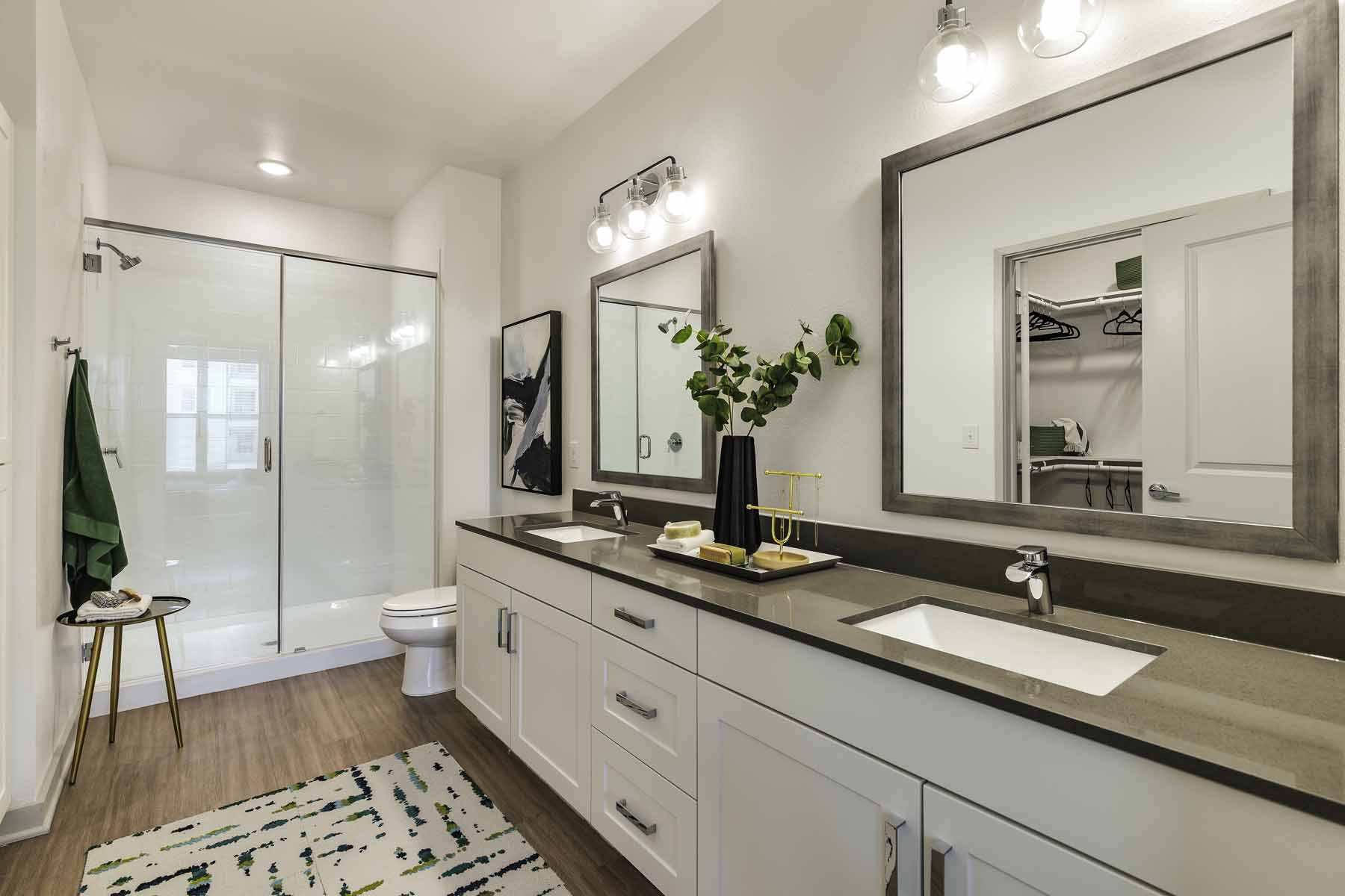 Quartz Countertops, Double Undermount Sinks* and Custom Framed Mirrors