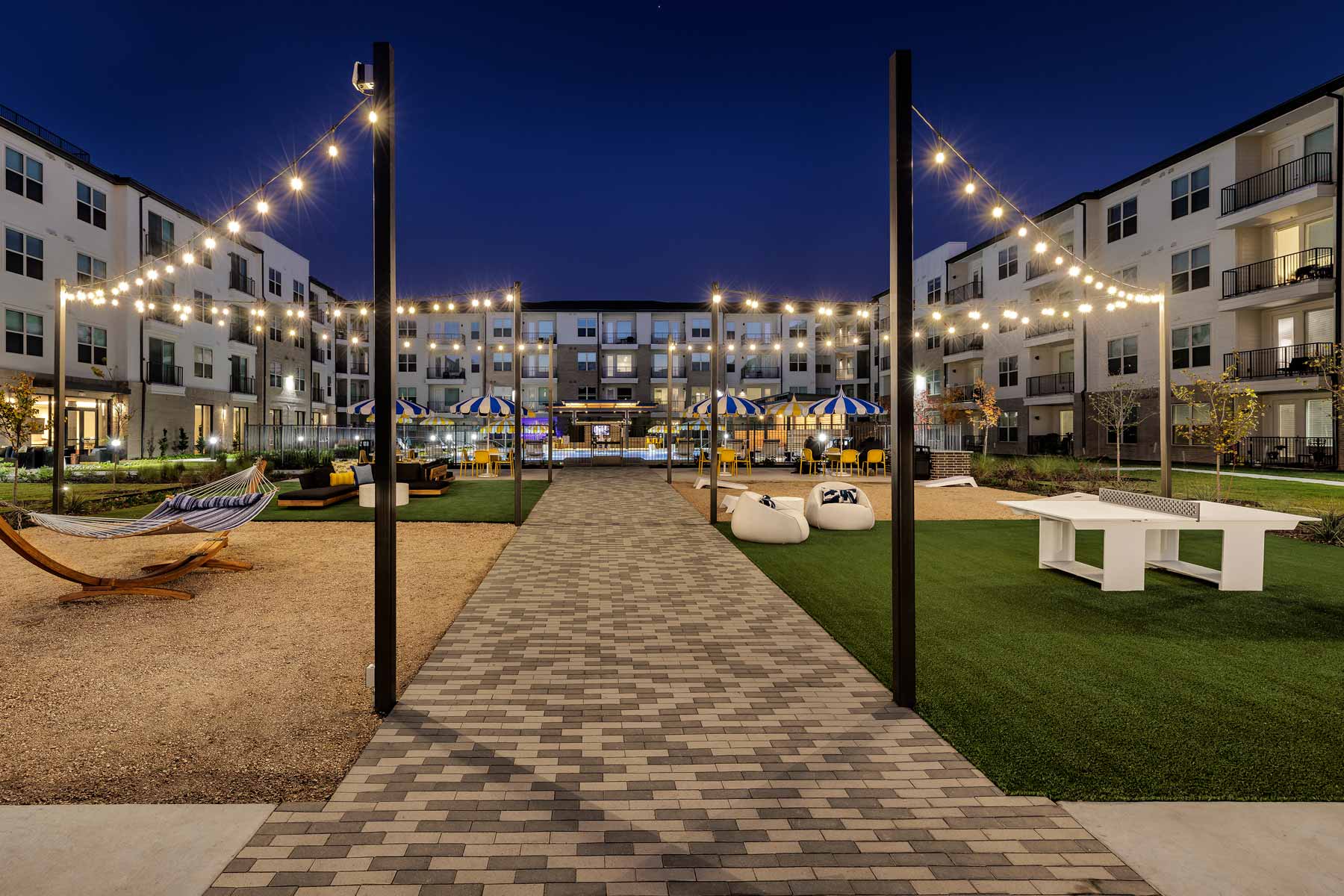 Relaxing courtyards featuring gaming lawns, outdoor kitchens and ample green space