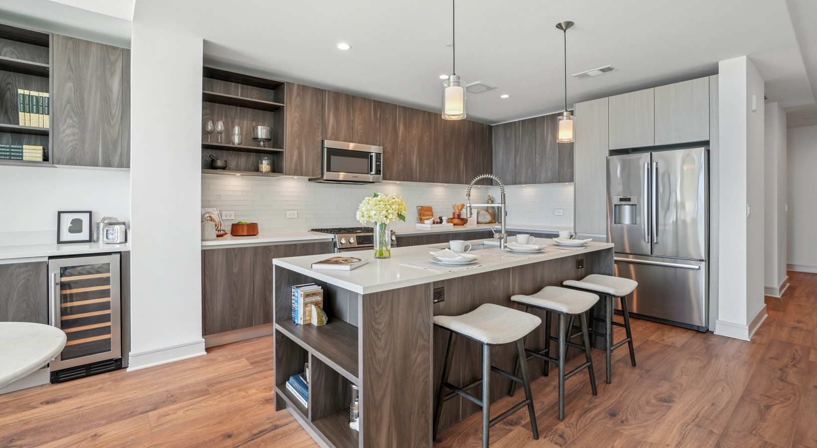 Wide-plank engineered hardwood floors in kitchen and living