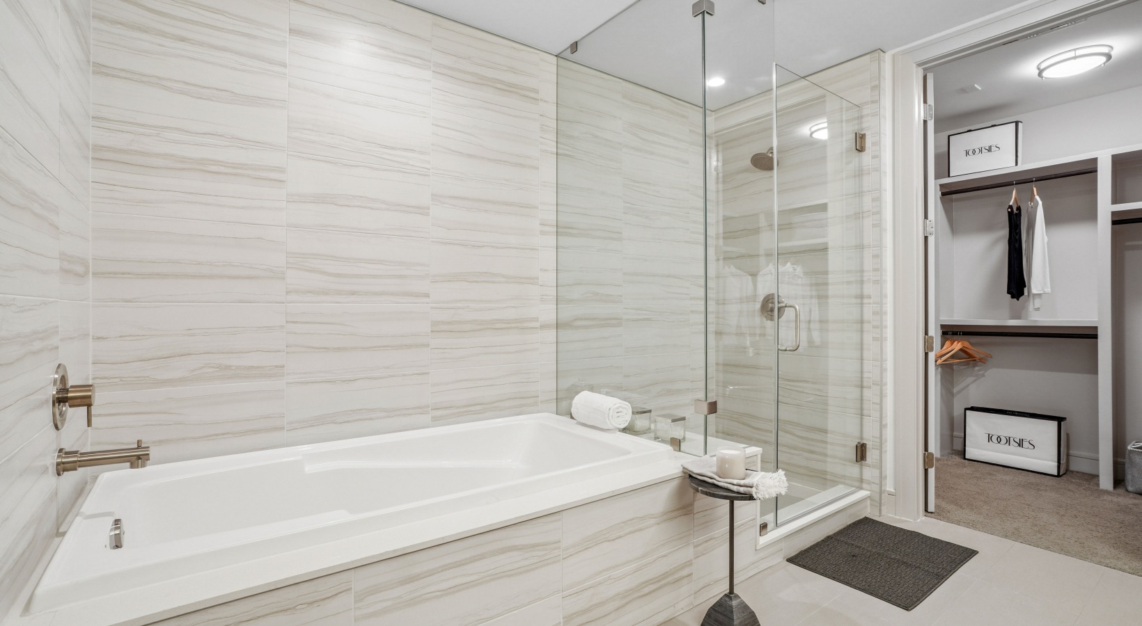 Generous walk-in closets with custom wood shelving