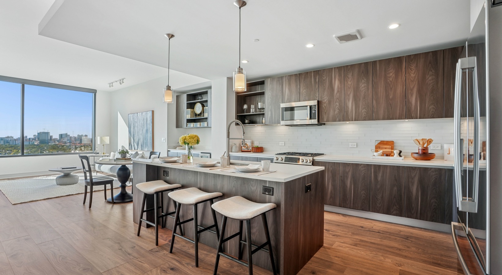 Wide-plank engineered hardwood floors in kitchen and living