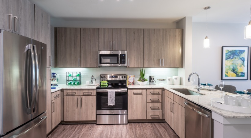 Stainless steel kitchen appliances & in-unit washer/dryer