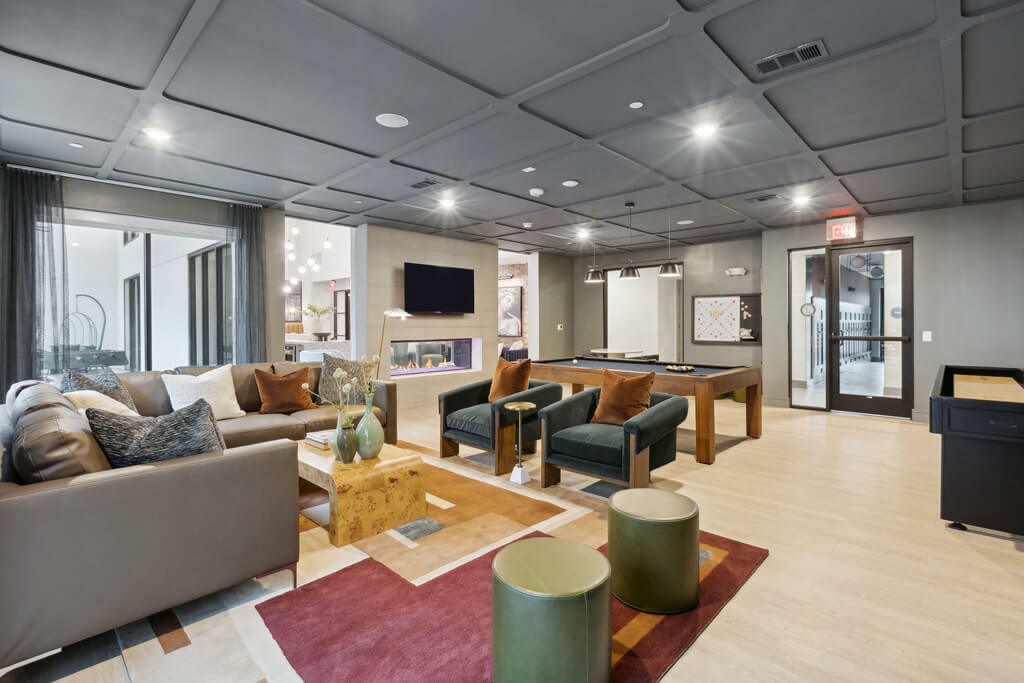 Social lounge with kitchen, game area, seating, and outdoor covered patio