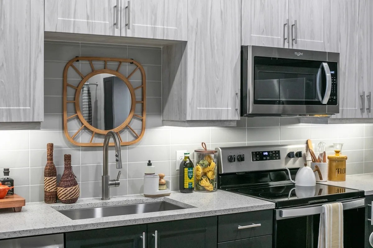 Gourmet kitchens with quartz countertops, 42-inch custom cabinetry, and under-cabinet lighting