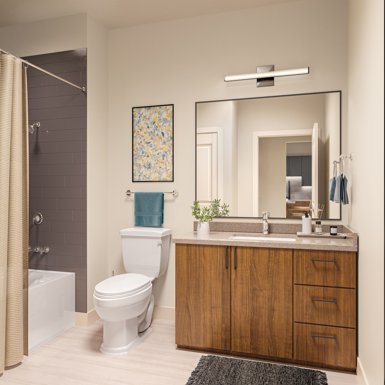 BOURBON design package: Bourbon main and matte white accent kitchen cabinets, brushed nickel cabinet hardware, light gray textured tile backsplash, gallery white polished quartz countertops, dark wood-style plank flooring in living spaces, gallery white polished quartz vanity, and gray porcelain tile bathroom floors