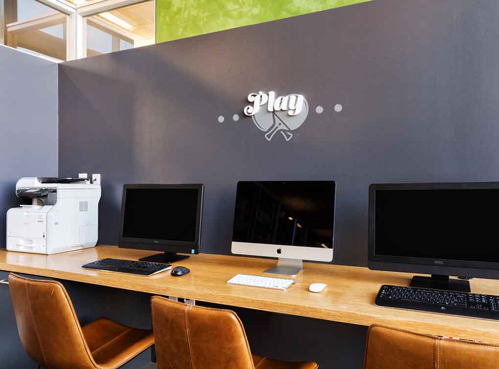 Work and play zone with 3 computers, wireless printing and ping pong table