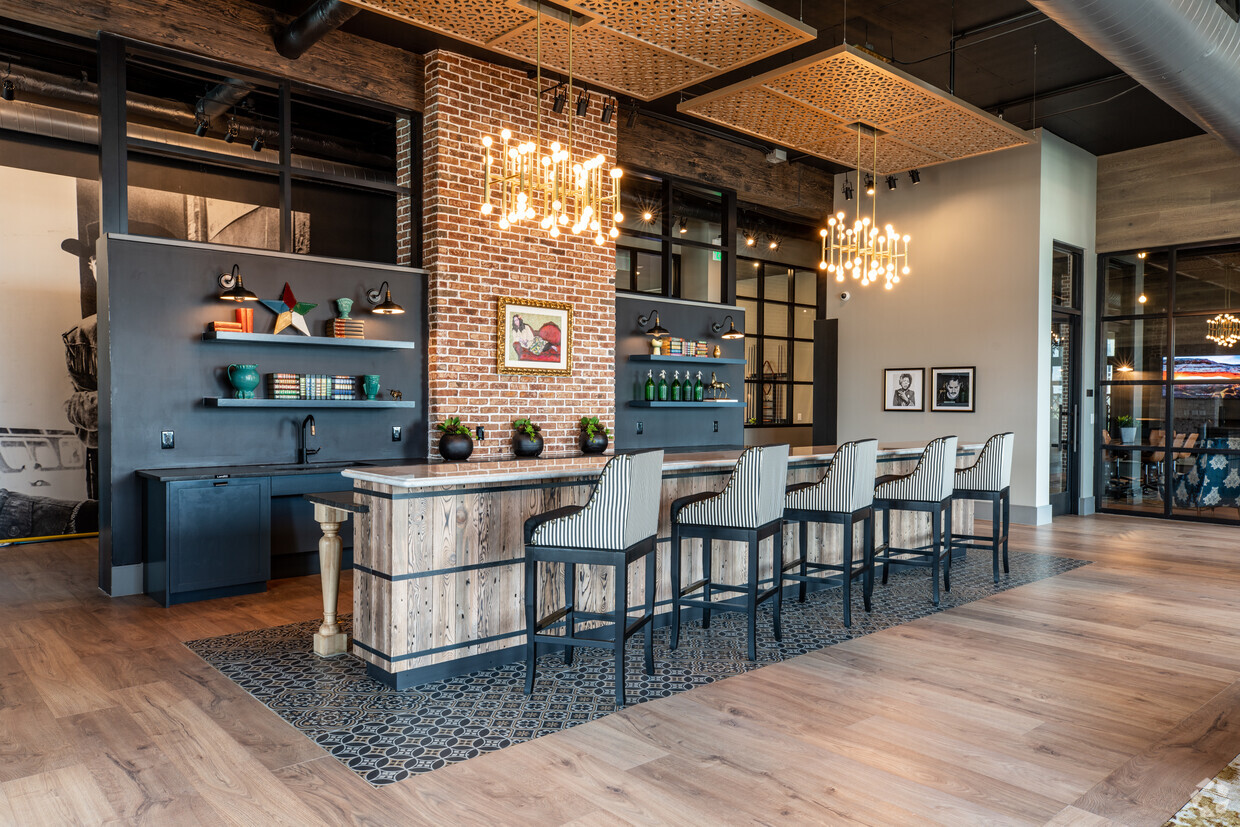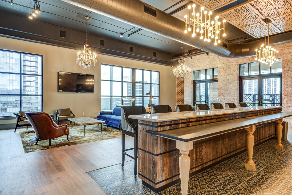 Club Room with a bar, lounge space, and an impressive double-sided fireplace