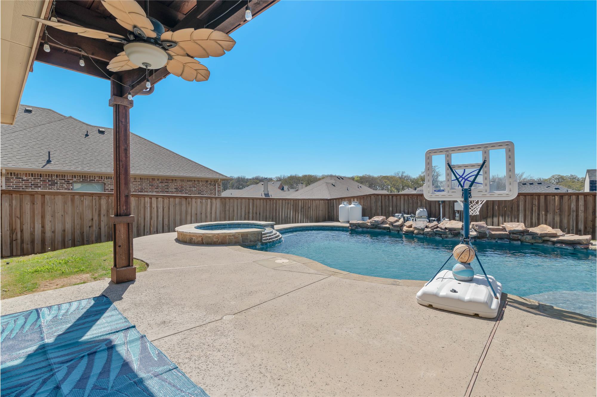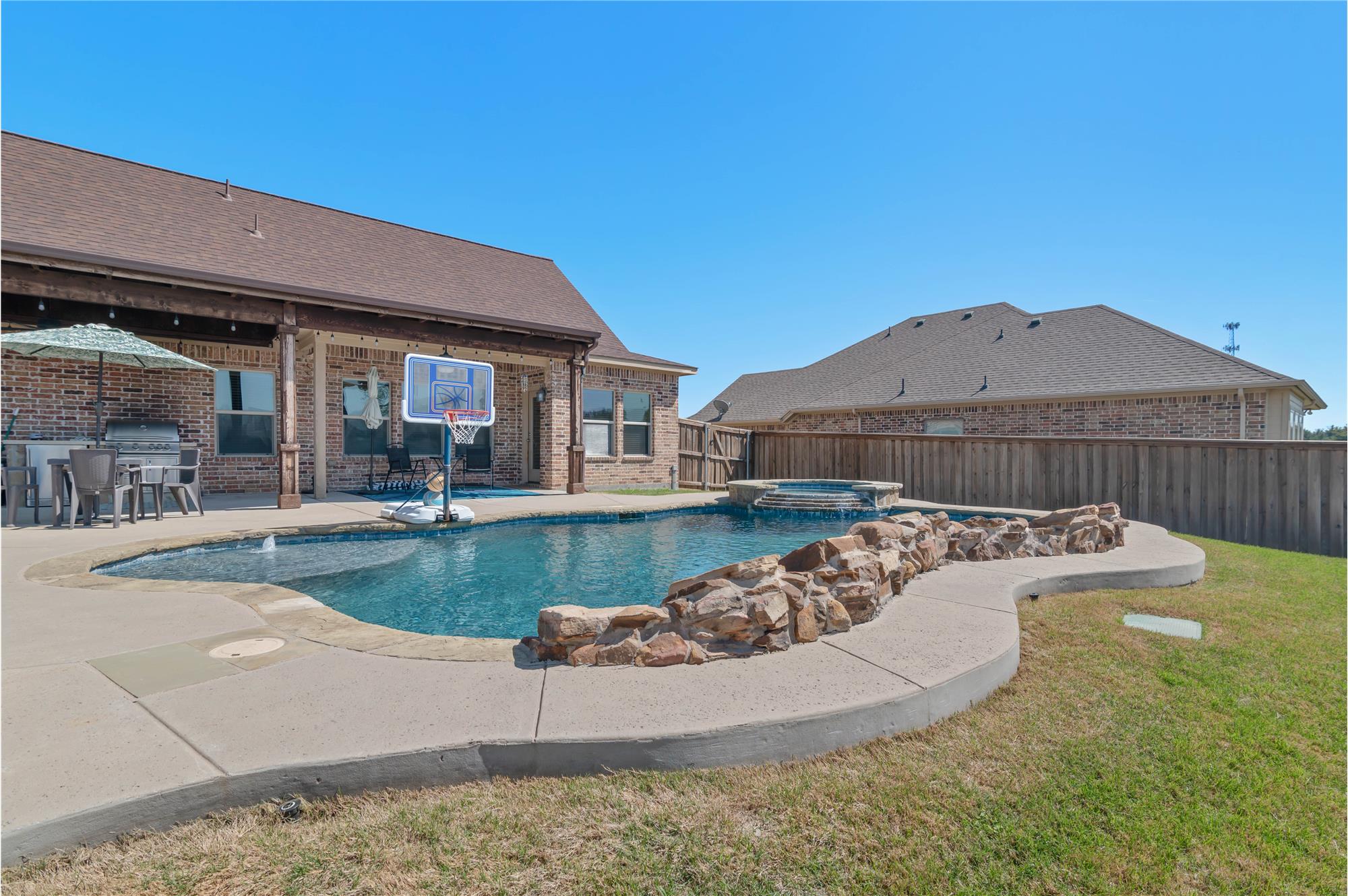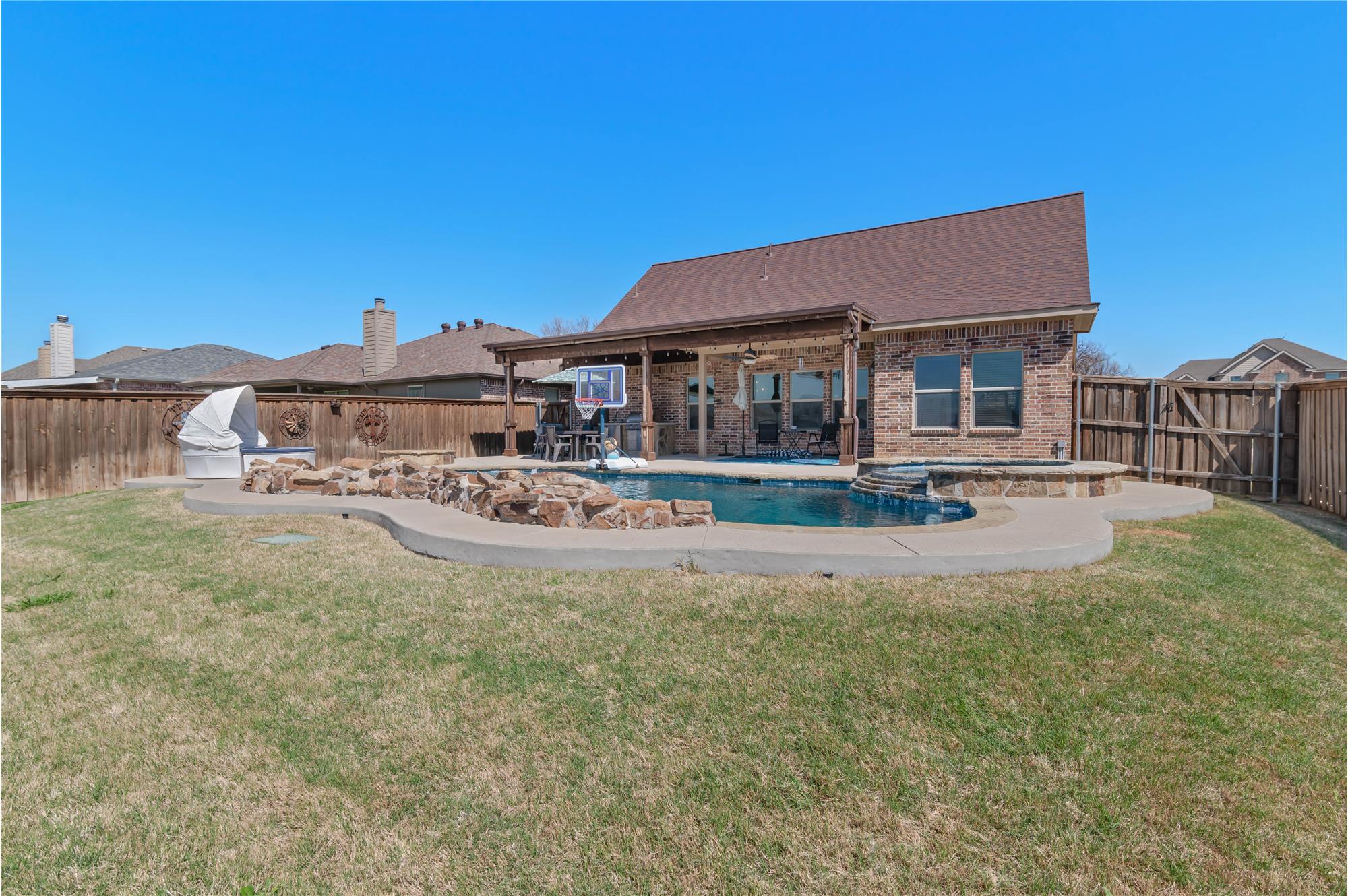 Resort-style backyard, no HOA, and a cul-de-sac location — this one delivers on every level. Tucked on a quiet street in Glen Oaks of Aubrey, this well-maintained 3-bedroom, 2.5-bath traditional brick home offers 2,060 sq ft of thoughtfully designed living space with the primary suite downstairs and exceptional outdoor living rarely found at this price point. Inside, the main level features luxury vinyl plank flooring and easy-care tile throughout — no carpet downstairs. The open layout flows from a large living room with views over the pool, into a generous kitchen nook and separate formal dining room. Upstairs you'll find two additional bedrooms, a full bath, and a large bonus room. The primary suite is a true retreat on the main floor with an en-suite bath featuring dual sinks, garden tub, and separate shower. Step outside to a resort-style freeform pool with attached spa and natural stone waterfall, stamped concrete surround, and a fully equipped outdoor kitchen area under a large covered patio with wood beam ceiling, ceiling fan, and string lights. Updated board-on-board privacy fence completes the outdoor space. Water heater is 1 year old and new roof in 2022! Zoned to Aubrey ISD. Minutes from Hwy 380 with quick access to Denton, Frisco, and the North Dallas Tollway. No HOA. Schedule your showing today!